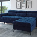 Jego L-kształtna forma naturalnie porządkuje przestrzeń salonu, tworząc przytulny kącik do wypoczynku. Głęboki granatowy odcień tapicerki buduje atmosferę spokoju i wyrafinowania. Idealnie pasuje zarówno do aranżacji w stylu boho, jak i do minimalistycznych, nowoczesnych kompozycji. Całość wspiera się na wysokich, czarnych nóżkach z metalu. Nadają one bryle wizualnej lekkości. Co ważne, tapicerowany tył mebla pozwala na dowolne ustawienie go w pokoju.