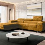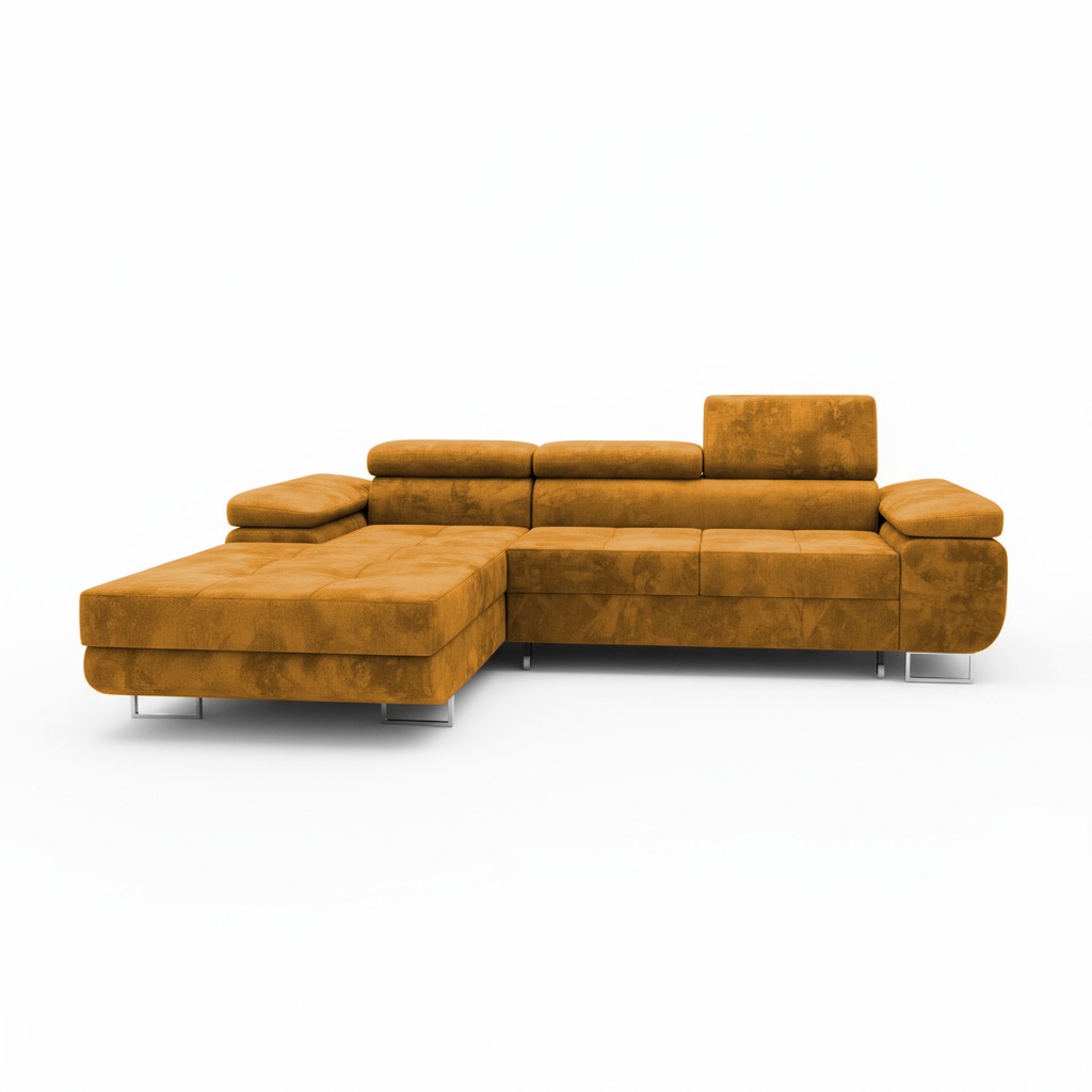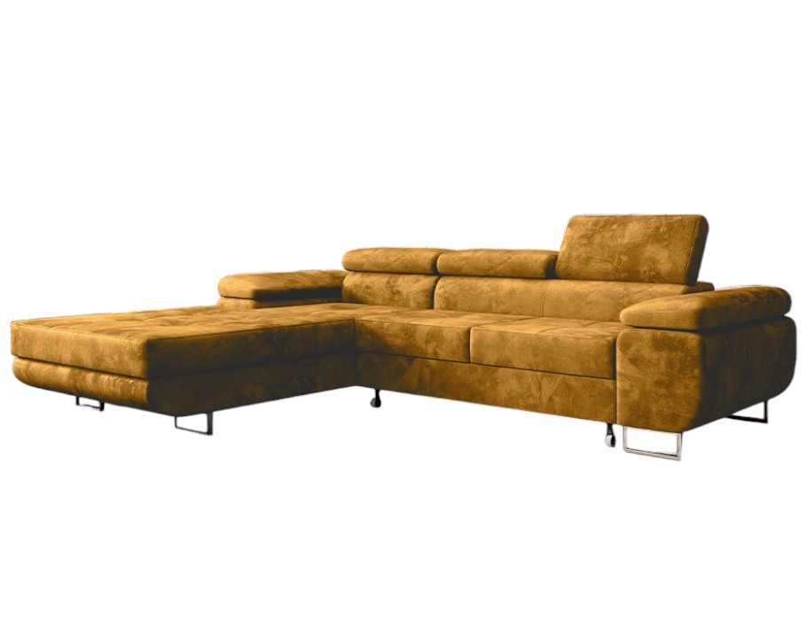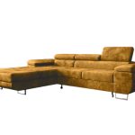 Jego nowoczesna bryła w kształcie litery L została osadzona na wysokich, chromowanych nóżkach. Dodają one konstrukcji wizualnej lekkości. Ciepły, musztardowy kolor tapicerki wprowadza do wnętrza energię oraz optymistyczny nastrój. Staje się wyrazistym akcentem, który ożywia aranżacje w stylu nowoczesnym i klasycznym. Co ważne, tapicerowany tył pozwala swobodnie ustawić mebel w dowolnym miejscu salonu.