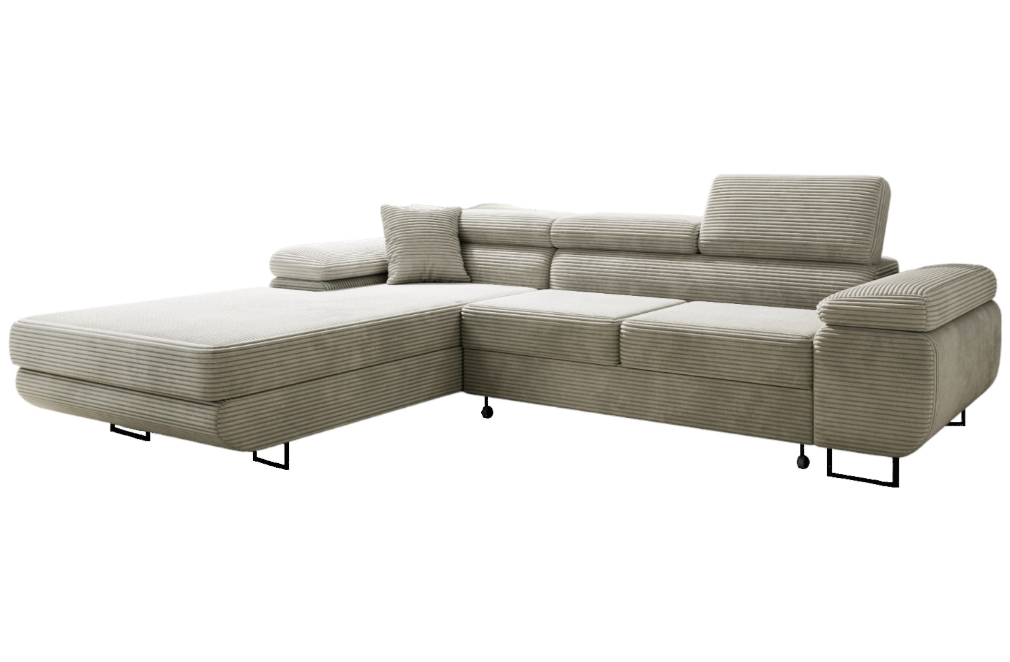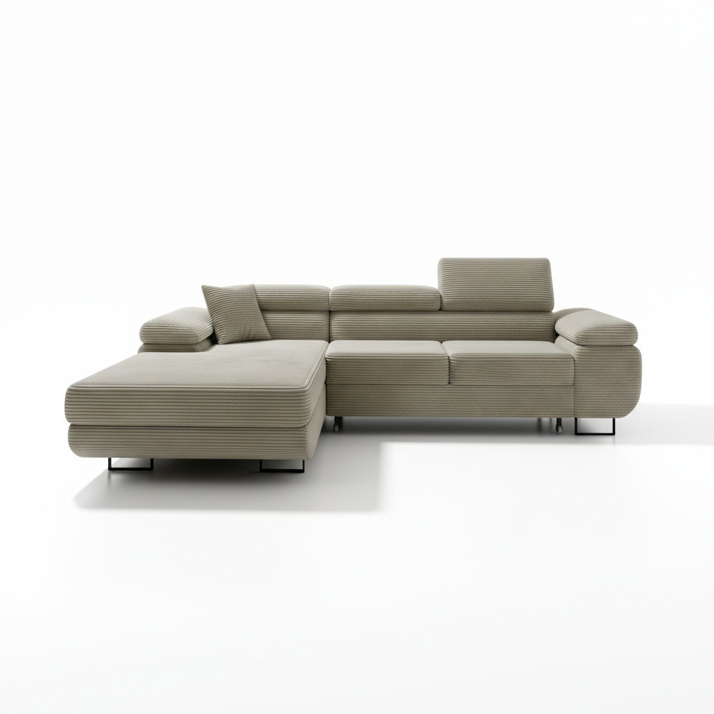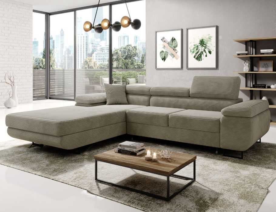 Siedzisko wypełnione sprężynami falistymi i elastyczną pianką zapewnia optymalny komfort. Dlatego narożnik jest idealnym miejscem do relaksu po długim dniu. Regulowane zagłówki pozwalają dopasować wysokość oparcia do indywidualnych potrzeb. W ten sposób można wygodnie oprzeć głowę podczas czytania książki lub oglądania filmu. Co ważne, sztruksowa tkanina Poso jest niezwykle przyjemna w dotyku. Jest także przyjazna zwierzętom, a jej właściwości ułatwiają utrzymanie czystości na co dzień.