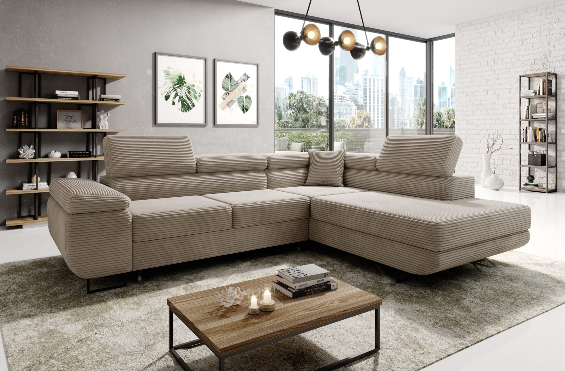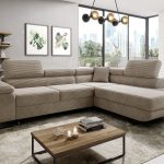 Jego układ w kształcie litery L doskonale organizuje przestrzeń w salonie, tworząc przytulne centrum wypoczynku. Subtelny beżowy kolor otula wnętrze ciepłem i spokojem. Dzięki temu mebel z łatwością dopasuje się do aranżacji w stylu skandynawskim, nowoczesnym lub minimalistycznym. Wysokie, czarne nóżki dodają konstrukcji wizualnej lekkości. Tapicerowany tył pozwala z kolei na ustawienie narożnika w dowolnym miejscu pokoju, nawet na jego środku.