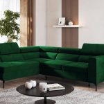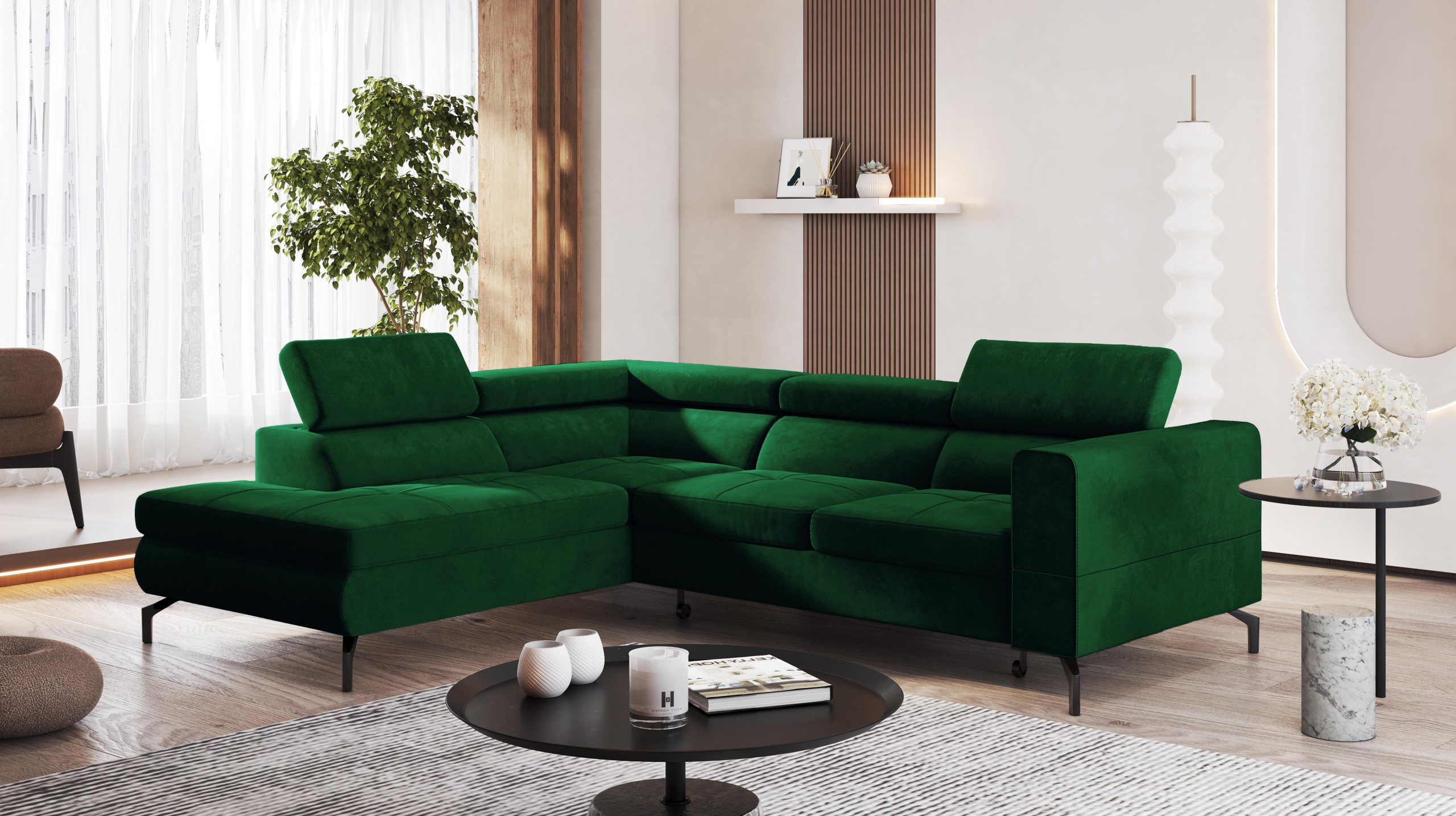 Jego nowoczesny design opiera się na prostych liniach oraz wysokich, czarnych nóżkach z metalu. Kształt litery L pozwala na wygodne zaaranżowanie przestrzeni w salonie, tworząc idealne miejsce do odpoczynku. Głęboki odcień butelkowej zieleni wprowadza do wnętrza spokój i elegancję. Dlatego narożnik świetnie komponuje się z drewnem, złotymi dodatkami czy jasnymi ścianami, nadając pomieszczeniu przytulny i wyrafinowany charakter. Co ważne, tapicerowany tył mebla umożliwia ustawienie go w dowolnym miejscu, nawet na środku pokoju.