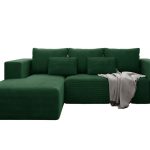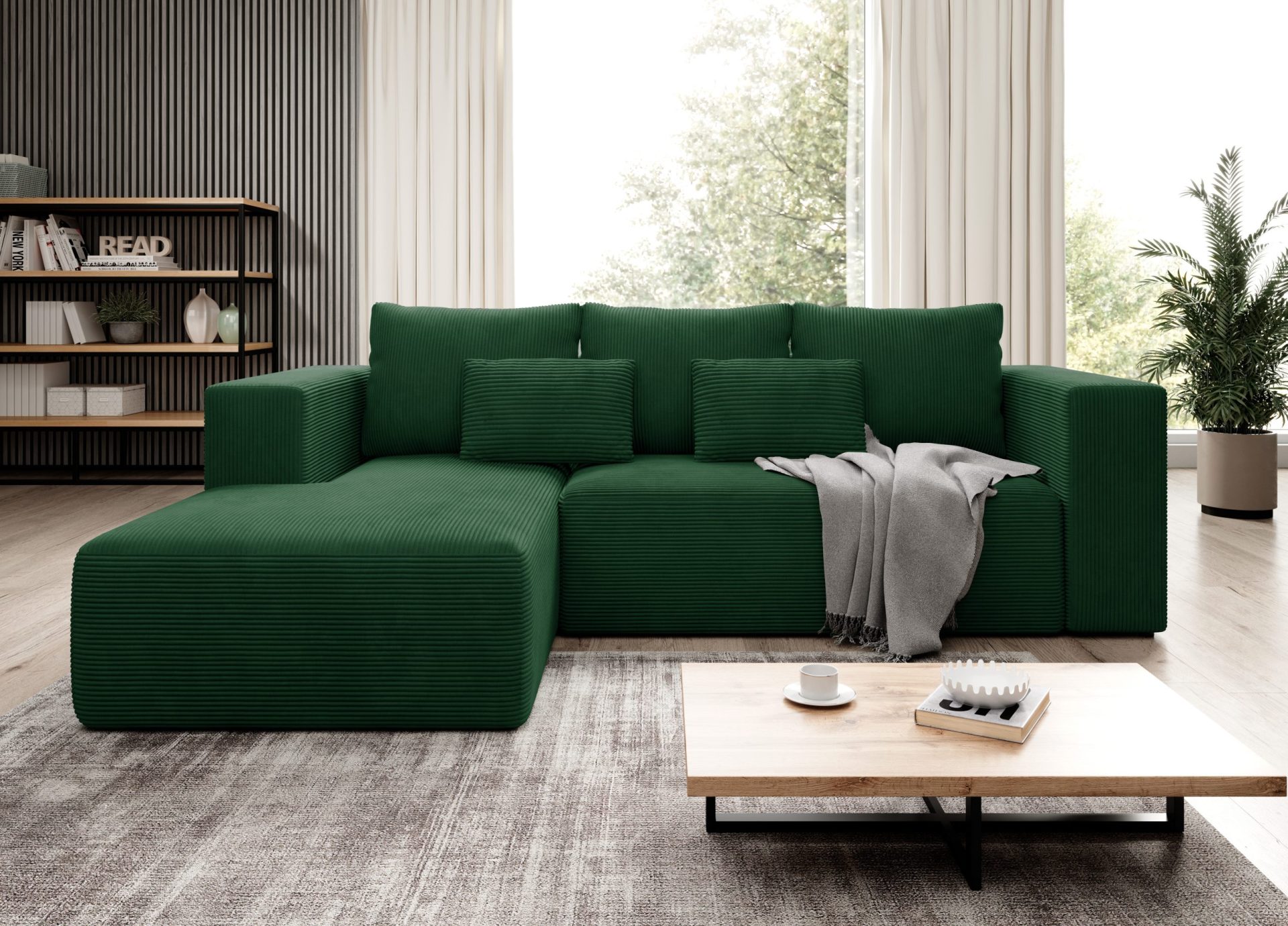 Jego bryła w kształcie litery L idealnie organizuje przestrzeń w salonie. Głęboki odcień butelkowej zieleni nadaje wnętrzu elegancji i szlachetnego spokoju. Dlatego mebel staje się wyrazistym, a zarazem przytulnym centrum domowego życia. Co ważne, tapicerowany tył pozwala ustawić go w dowolnym miejscu. W ten sposób doskonale prezentuje się nawet na środku pokoju.