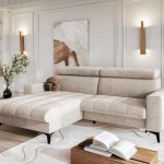 Kremowy odcień tkaniny welurowej rozjaśnia wnętrze. Wprowadza do niego atmosferę spokoju i przytulności, idealną do relaksu po długim dniu. Ten neutralny kolor stanowi doskonałą bazę dla różnych stylów, od minimalistycznych po skandynawskie. L-kształtny układ mebla naturalnie organizuje przestrzeň. Zachęca do wspólnego spędzania czasu z rodziną i przyjaciółmi w komfortowych warunkach.