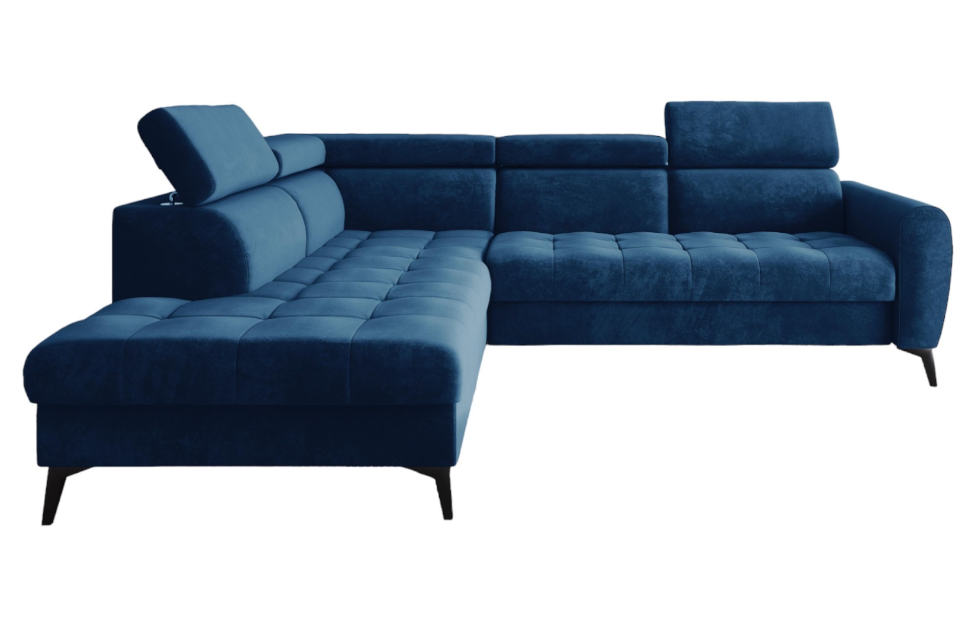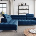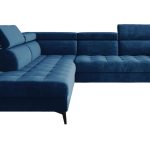 Jego forma w kształcie litery L została osadzona na wysokich, chromowanych nogach. Dzięki temu mebel zyskuje wizualną lekkość. Tapicerowany tył pozwala na ustawienie go w dowolnym miejscu salonu. Co ważne, głęboki granatowy odcień tkaniny Monolith tworzy we wnętrzu atmosferę spokoju i elegancji. Pasuje on doskonale do aranżacji nowoczesnych. Sprawdzi się również w klasycznych przestrzeniach.