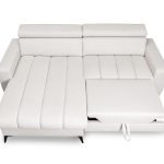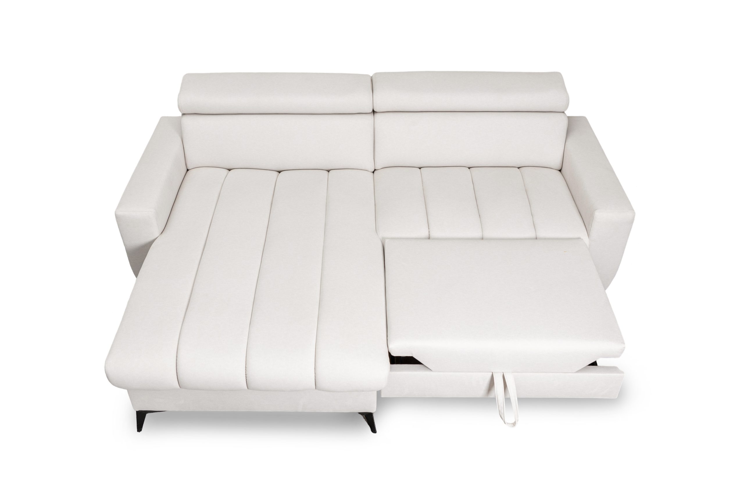 Narożnik Bonito jest również przygotowany na wizytę gości. Posiada funkcję spania, a jej rozkładanie za pomocą automatu Delfin okazuje się proste i szybkie. W kilka chwil salon zmienia się w komfortową sypialnię dla dwóch osób. Co ważne, mebel wyposażono w pojemny pojemnik na pościel. Można w nim schować kołdrę i poduszki, utrzymując porządek na co dzień.