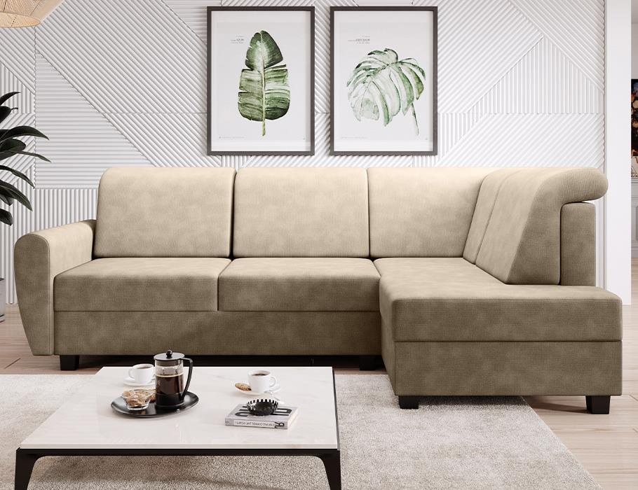 Jego forma w kształcie litery L doskonale organizuje przestrzeń w salonie. Zaprasza do wspólnego spędzania czasu. Ciepły, beżowy odcień tapicerki wprowadza do wnętrza spokój i poczucie przytulności. Dlatego świetnie komponuje się z aranżacjami w stylu skandynawskim lub minimalistycznym. Niskie nóżki z drewna w kolorze wenge subtelnie podkreślają elegancką linię mebla.