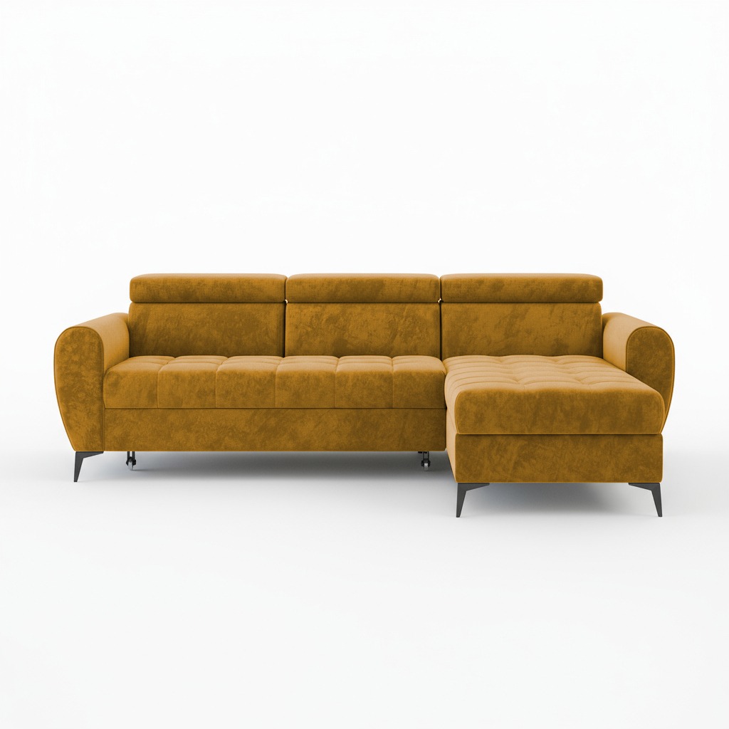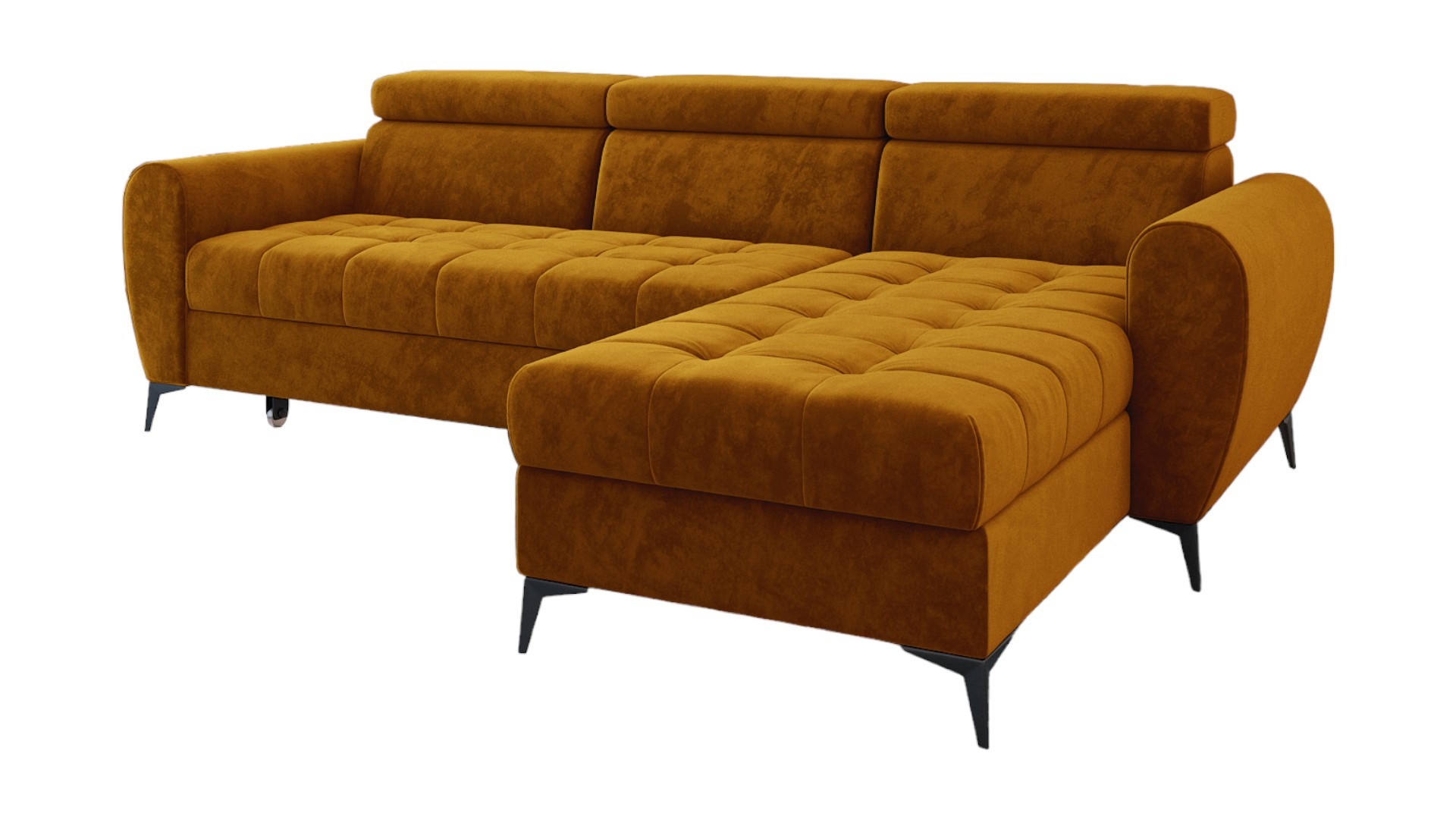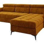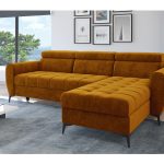 Jego nowoczesna bryła w kształcie litery L została osadzona na wysokich, czarnych nogach. Dzięki temu mebel zyskuje wizualną lekkość i elegancję. Charakterystyczny, musztardowy kolor wprowadza do wnętrza ciepło i optymistyczną energię. Sprawdzi się doskonale w aranżacjach w stylu boho oraz nowoczesnym. Co ważne, tapicerowany tył pozwala ustawić narożnik w dowolnym miejscu, nawet na środku salonu.