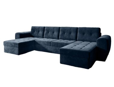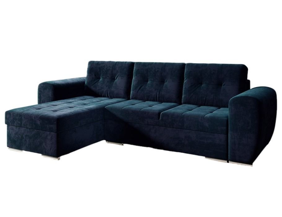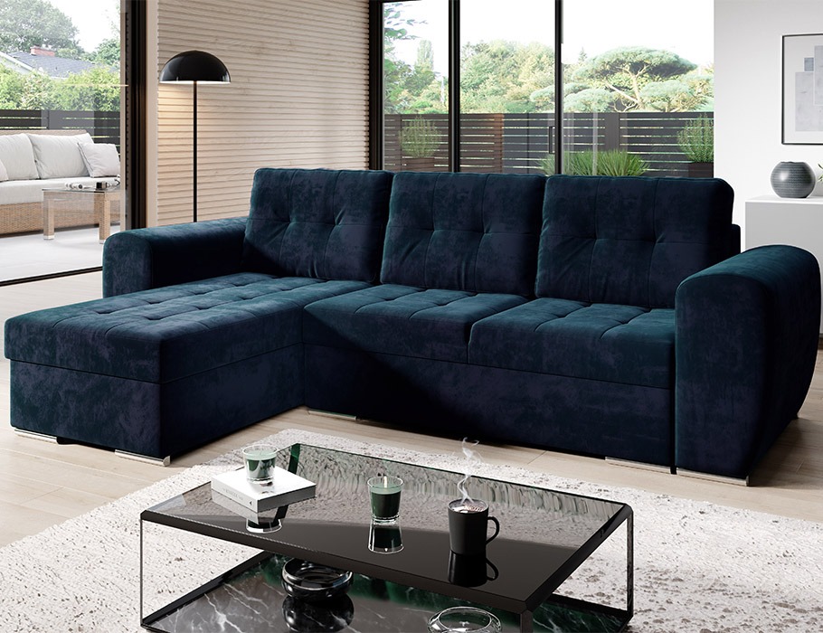 Głęboki granat narożnika Bari wprowadza do salonu nutę ponadczasowej elegancji.