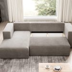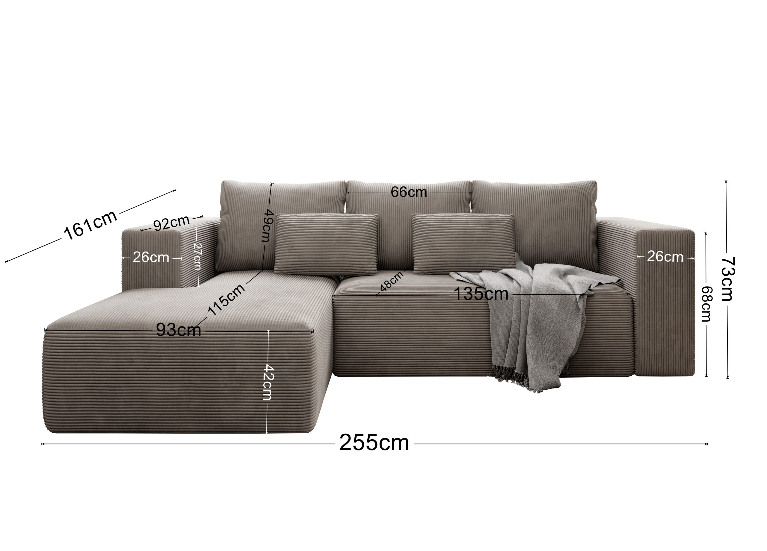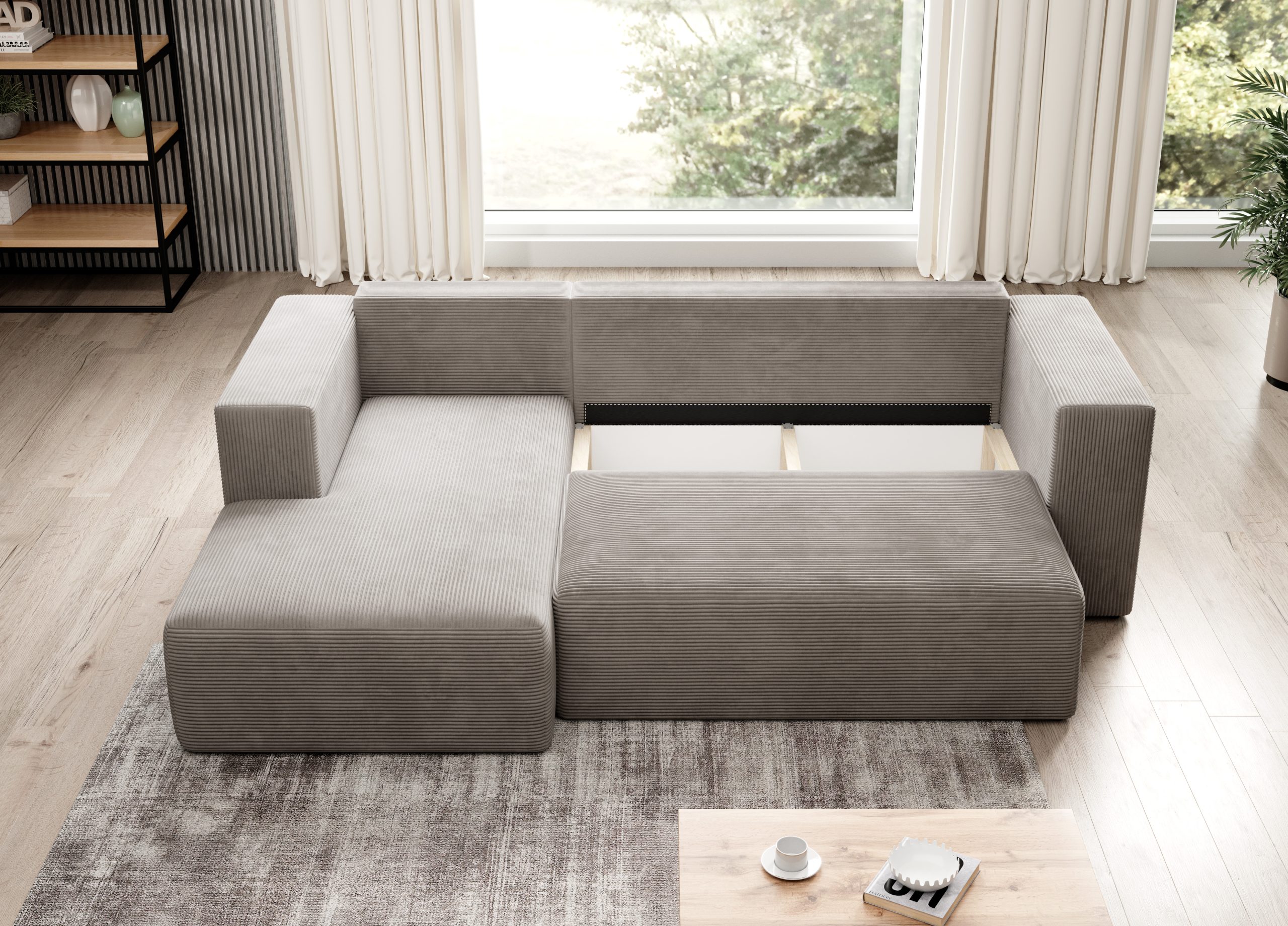 Narożnik Stripes oferuje również komfortową funkcję spania. Rozkładanie za pomocą automatu DL odbywa się bez wysiłku. W ten sposób w kilka chwil przygotujesz wygodne miejsce dla gości. Pojemny schowek na pościel pomaga z kolei utrzymać porządek w salonie. Można w nim przechować dodatkowe koce lub poduszki.