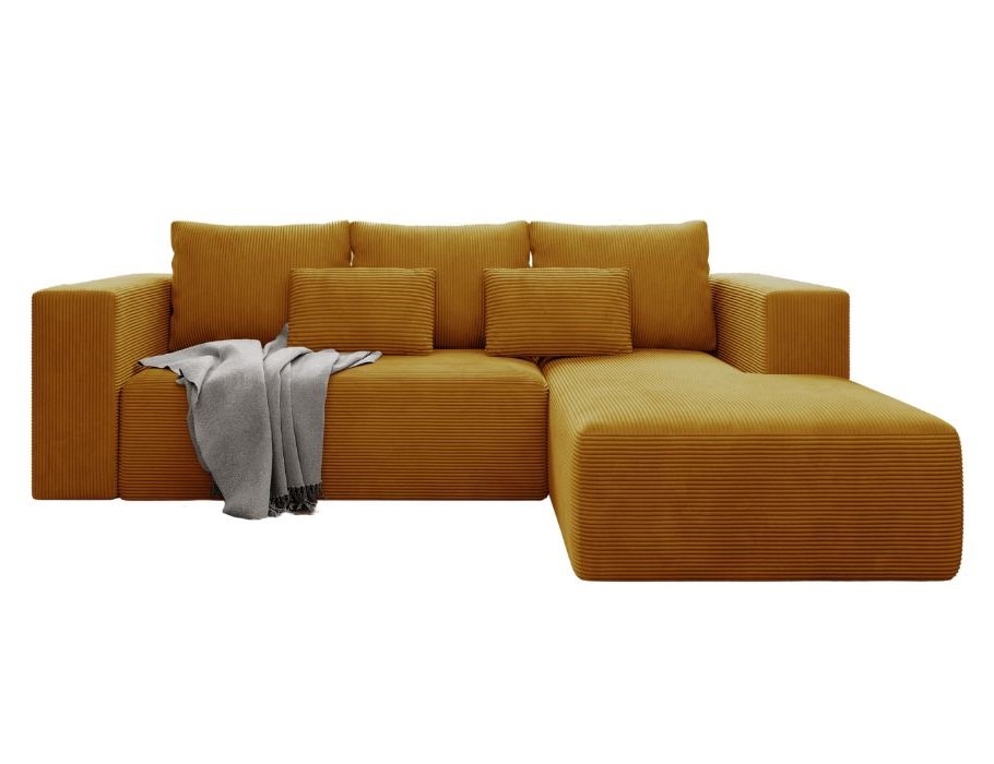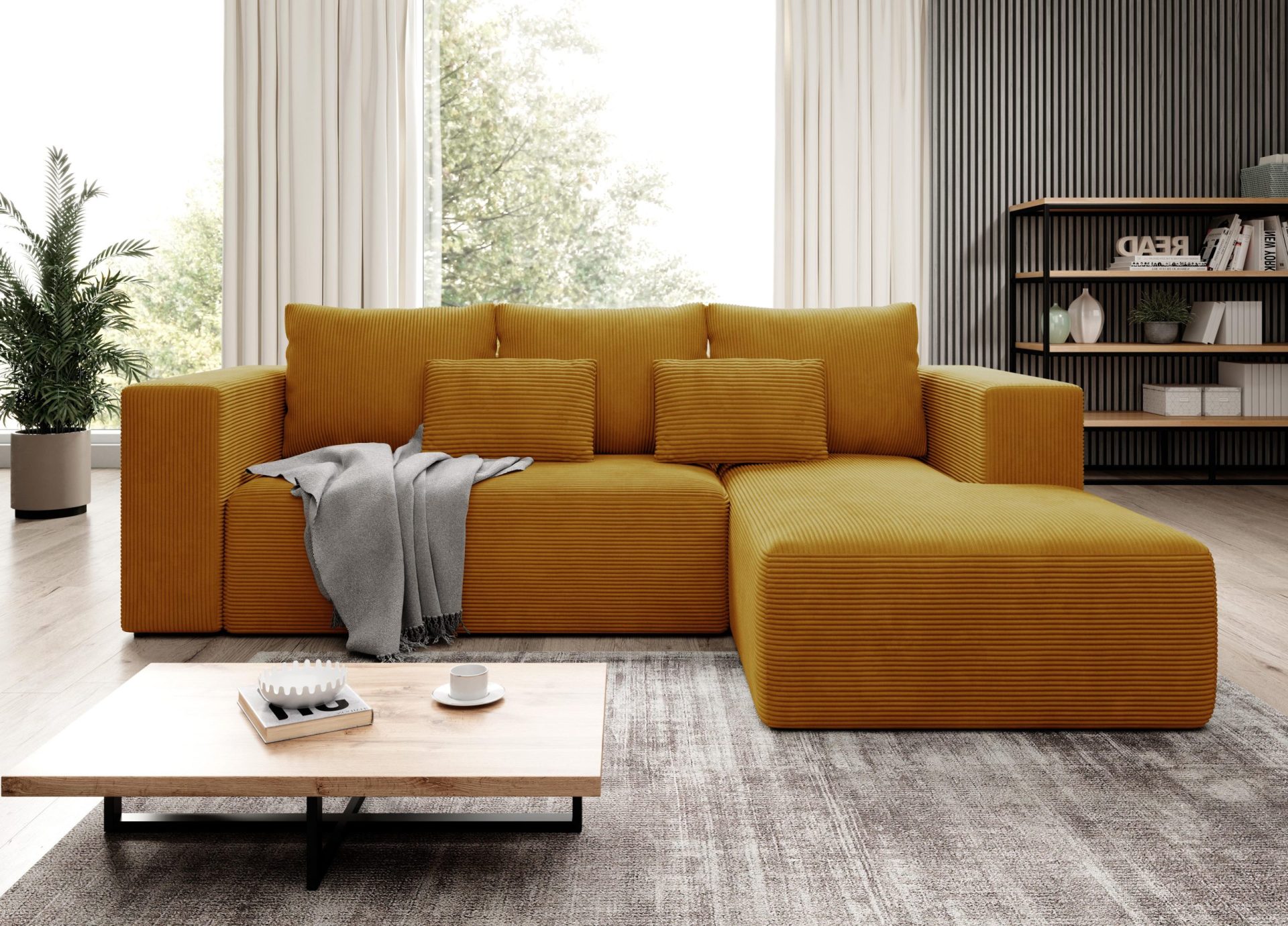 Wyrazisty, musztardowy kolor mebla staje się centralnym punktem aranżacji. Wprowadza do salonu ciepłą, optymistyczną energię. Dlatego narożnik świetnie komponuje się z wnętrzami w stylu nowoczesnym lub klasycznym. W kształcie litery L idealnie organizuje przestrzeń do wypoczynku. Dzięki tapicerowanemu tyłowi można go ustawić w dowolnym miejscu, nie tylko przy ścianie.