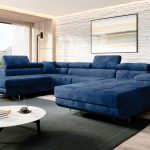 Jego duży, symetryczny kształt w formie litery U tworzy w salonie strefę relaksu dla całej rodziny. Nowoczesny charakter bryły podkreślają wysokie, chromowane nóżki dodające jej wizualnej lekkości. Głęboki granat tapicerki wprowadza do wnętrza atmosferę elegancji i spokoju. Ten szlachetny kolor pięknie prezentuje się w jasnych, przestronnych pomieszczeniach w stylu nowoczesnym lub glamour. Co ważne, tapicerowany tył mebla pozwala na dowolne ustawienie go w aranżacji.