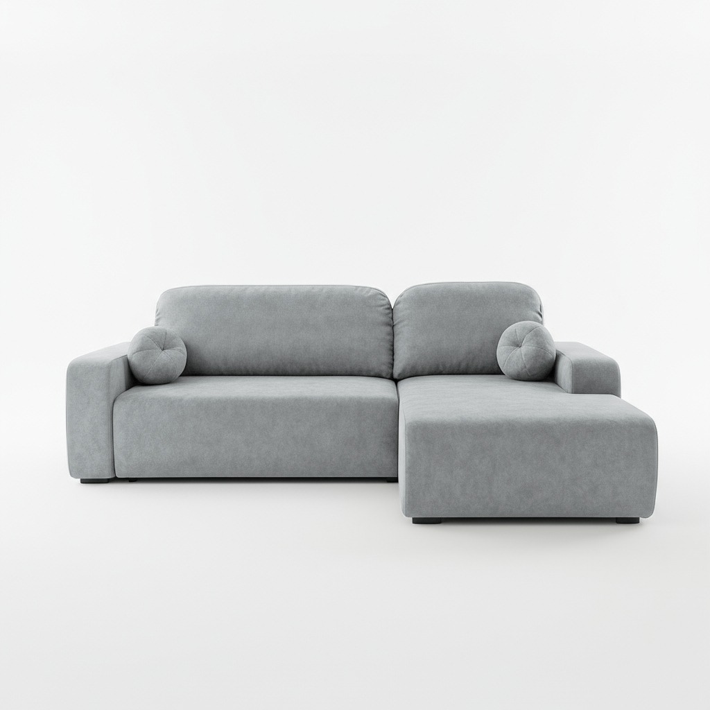 Obicie narożnika wykonano z tkaniny Cloud – niezwykle miękkiego i aksamitnego w dotyku weluru. Jej niejednolita, melanżowa barwa w połączeniu z matowym wykończeniem nadaje narożnikowi eleganckiego wyglądu. Dodatkowo, dzięki filcowemu podkładowi, materiał jest mięsisty, gruby i plastyczny, co pięknie podkreśla nowoczesną bryłę mebla.
