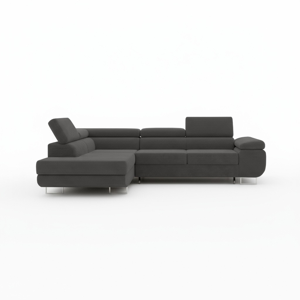 Komfort codziennego użytkowania zapewniają siedziska wypełnione sprężynami falistymi i elastyczną pianką. Gwarantują one odpowiednią sprężystość oraz wygodę podczas relaksu po długim dniu. Dzięki regulowanym zagłówkom każdy domownik znajdzie idealne podparcie dla głowy. To świetne rozwiązanie podczas wieczornego maratonu filmowego lub czytania książki. W ten sposób narożnik dopasowuje się do indywidualnych potrzeb.