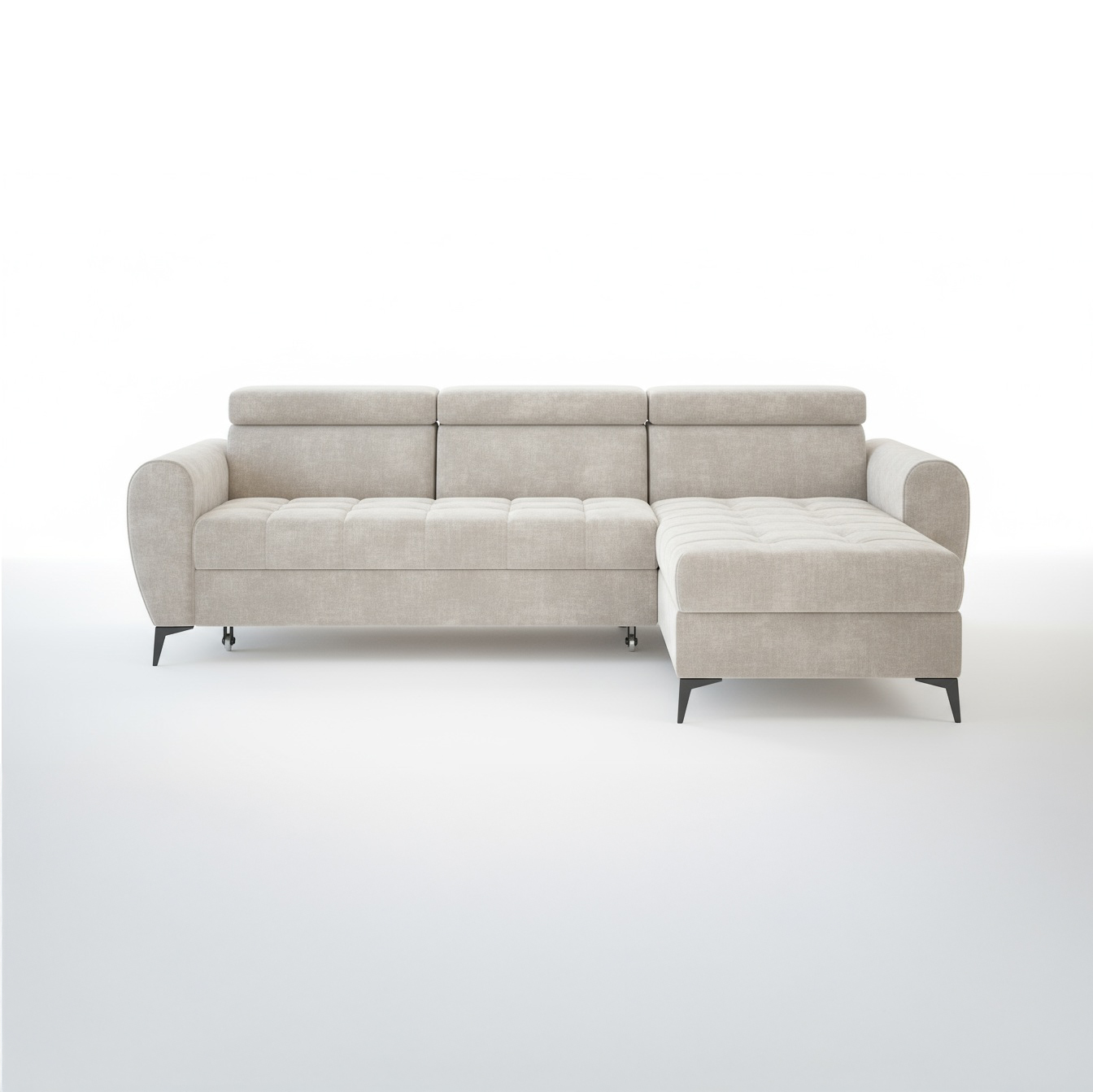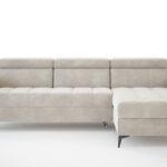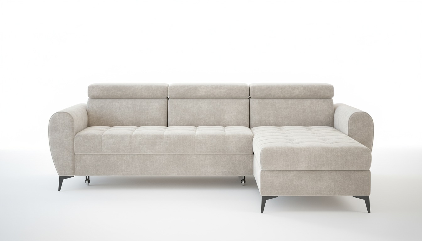 Jego przemyślany projekt w kształcie litery L idealnie wpasuje się w przestronne salony. Wysokie, czarne nóżki dodają konstrukcji wizualnej lekkości. Subtelnie podkreślają nowoczesny charakter mebla. Jasnobeżowy odcień tapicerki wprowadza do wnętrza atmosferę ciepła i spokoju. Dzięki niemu salon staje się przytulną oazą, która sprzyja wyciszeniu po długim dniu.