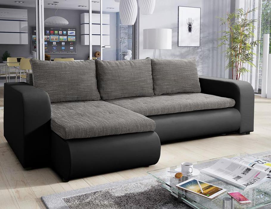 Dwukolorowa tapicerka wprowadza do wnętrza ponadczasową elegancję. Szarość siedziska i poduszek ociepla aranżację. Z kolei czarna podstawa z ekoskóry dodaje jej wyrazistego charakteru. Taka paleta barw doskonale pasuje do nowoczesnych oraz klasycznych salonów. Co ważne, narożnik ma tapicerowany tył. Dlatego można go ustawić w dowolnym miejscu, nawet na środku pokoju.