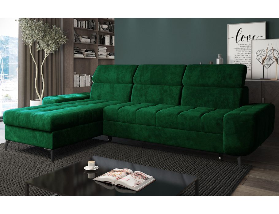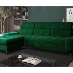 Jego nowoczesna bryła w kształcie litery L idealnie organizuje przestrzeń. Wysokie, czarne metalowe nóżki dodają jej wizualnej lekkości. Głęboki odcień butelkowej zieleni tworzy we wnętrzu przytulny i spokojny nastrój. Kolor ten doskonale komponuje się z elementami drewna, złota oraz neutralnymi barwami. Co ważne, tapicerowany tył mebla pozwala na ustawienie go w dowolnym miejscu pokoju.