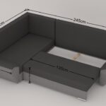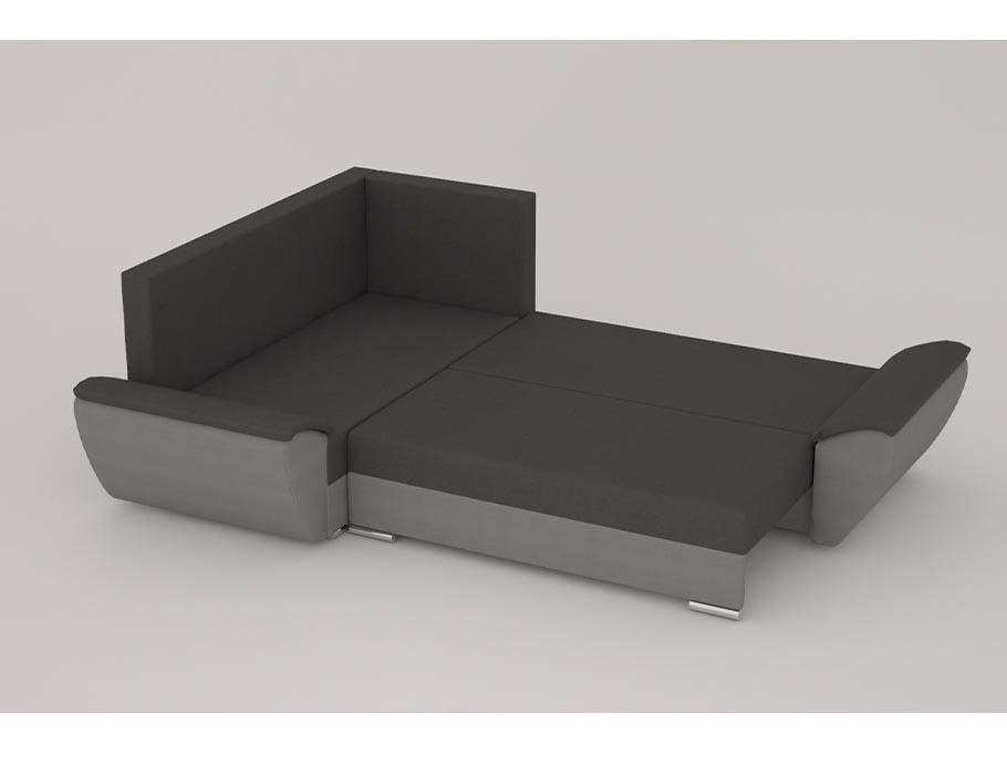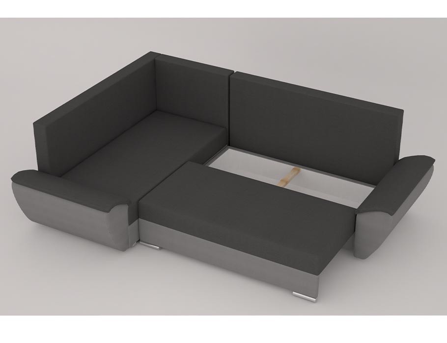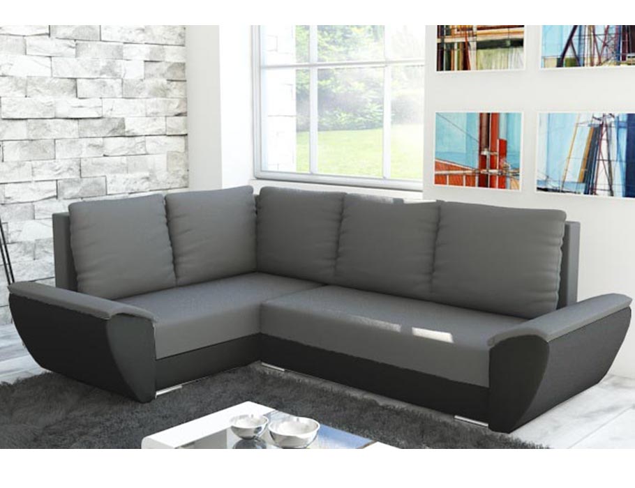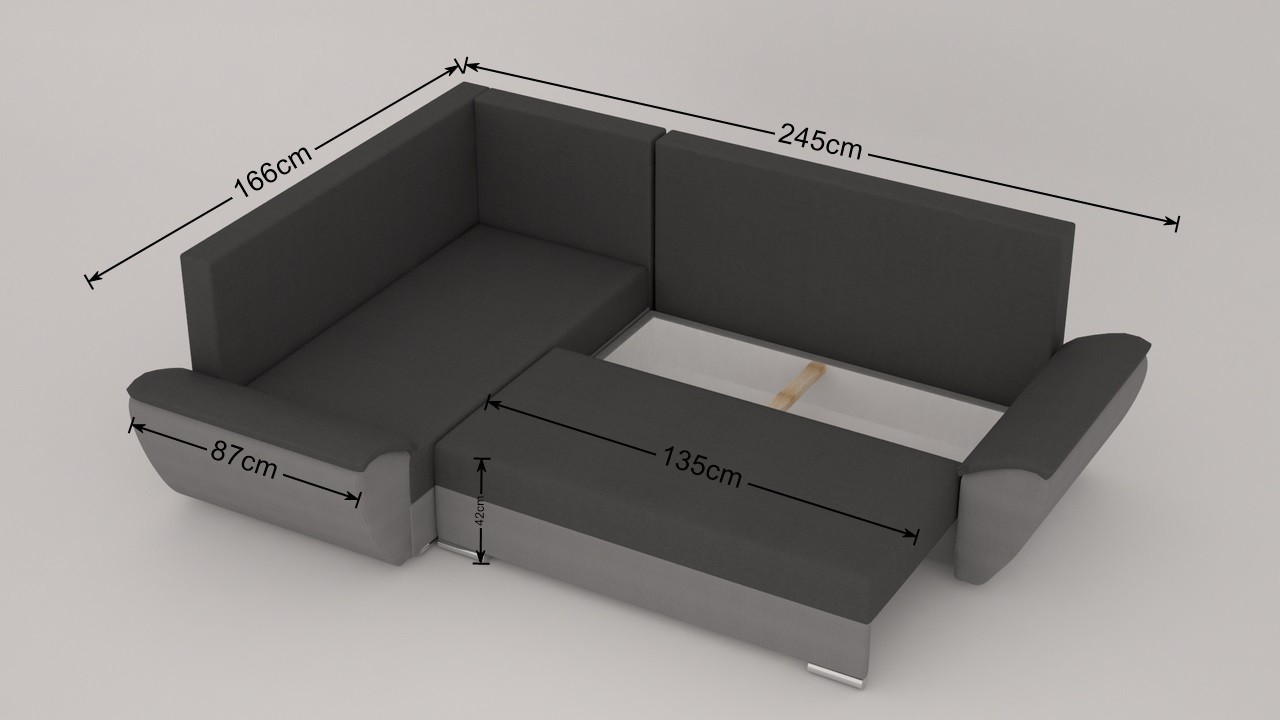 Jego ponadczasowy wygląd z łatwością dopasuje się do nowoczesnych oraz klasycznych aranżacji. Mebel ma praktyczny kształt litery L. Dzięki temu naturalnie wyznacza strefę relaksu w salonie, stając się jego centralnym punktem. Połączenie szarości i czerni wprowadza do wnętrza spokój oraz elegancję. Taka kolorystyka stanowi doskonałą bazę dla wyrazistych dodatków lub uzupełnia minimalistyczny wystrój. Chromowane nóżki dodają całości subtelnej lekkości.