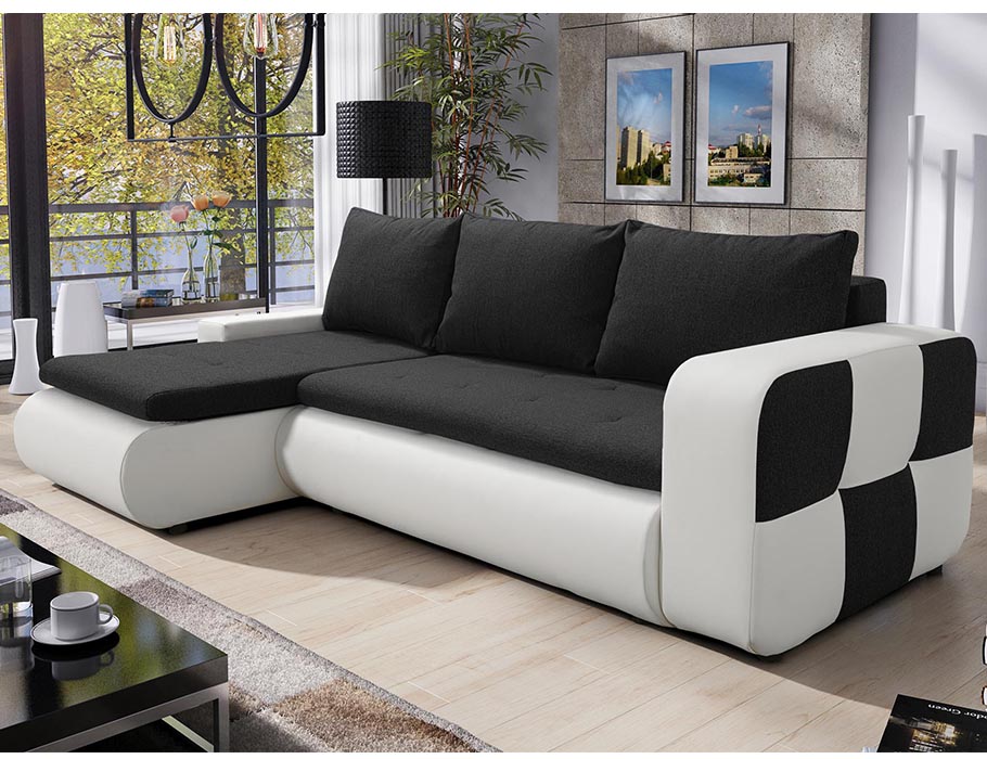 Jego bryła w kształcie litery L doskonale organizuje przestrzeń w salonie. Tworzy wyznaczone miejsce do odpoczynku lub spotkań z bliskimi. Wyrazisty kontrast czerni i bieli nadaje wnętrzu dynamicznego, nowoczesnego charakteru. Dlatego czarno-biały narożnik Bronx świetnie komponuje się z minimalistycznymi lub loftowymi aranżacjami. Co ważne, tapicerowany tył pozwala na ustawienie mebla w dowolnym miejscu. Zyskuje on status centralnego punktu pokoju dziennego.