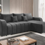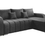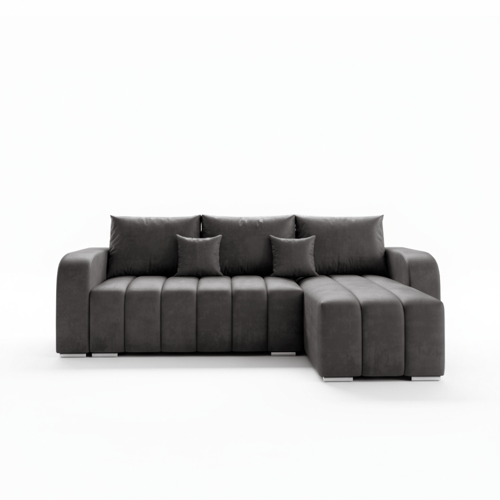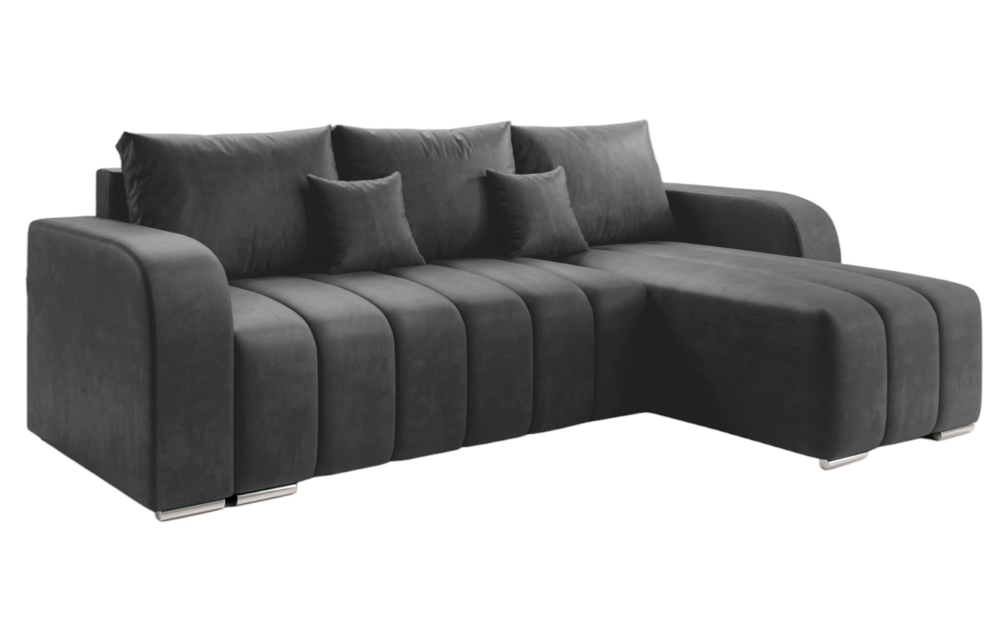 Głęboki grafitowy odcień wprowadza do wnętrza atmosferę elegancji i spokoju. Stanowi doskonałą bazę dla wielu aranżacji. Dlatego mebel świetnie odnajdzie się zarówno w nowoczesnych, jak i klasycznych salonach. Jego uniwersalny charakter podkreślają proste linie oraz niskie, chromowane nóżki dodające subtelnej lekkości. Kształt w formie litery L pozwala na wygodne zaaranżowanie przestrzeni w pokoju dziennym.