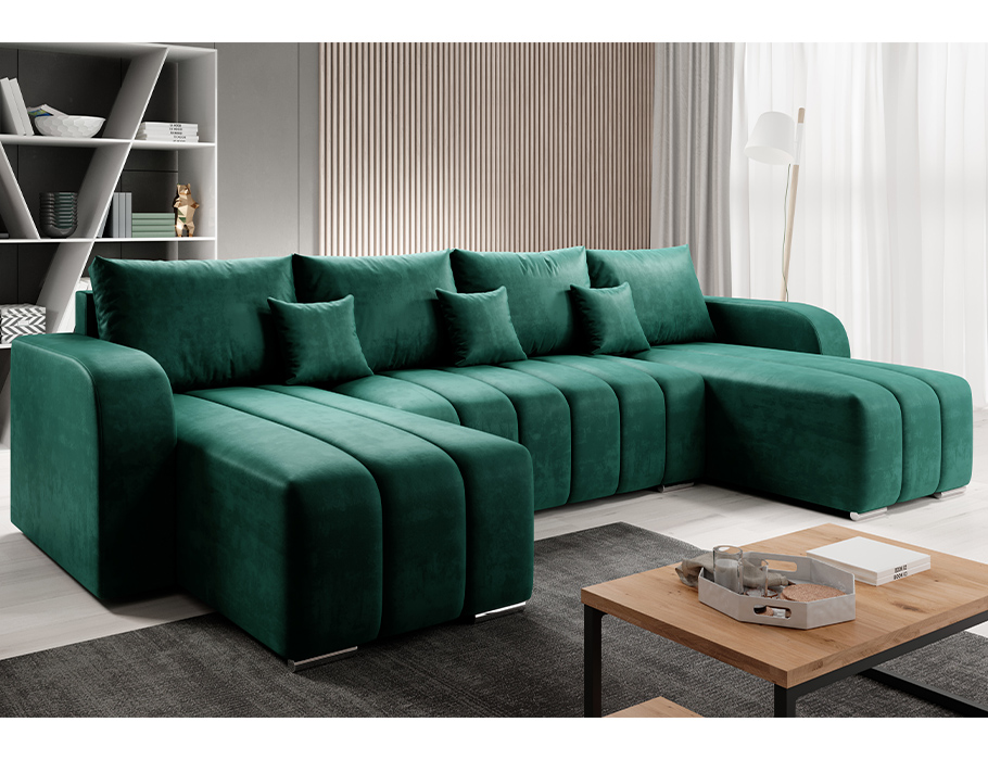 Jego symetryczny kształt litery U tworzy w salonie przytulną strefę relaksu. Mebel doskonale odnajdzie się zarówno w nowoczesnych, jak i klasycznych aranżacjach. Niskie, chromowane nóżki dodają mu lekkości oraz subtelnej elegancji. Co ważne, tapicerowany tył pozwala na ustawienie narożnika w dowolnym miejscu. Może on stać się centralnym punktem pokoju dziennego lub dyskretnie oddzielać strefy w otwartej przestrzeni.