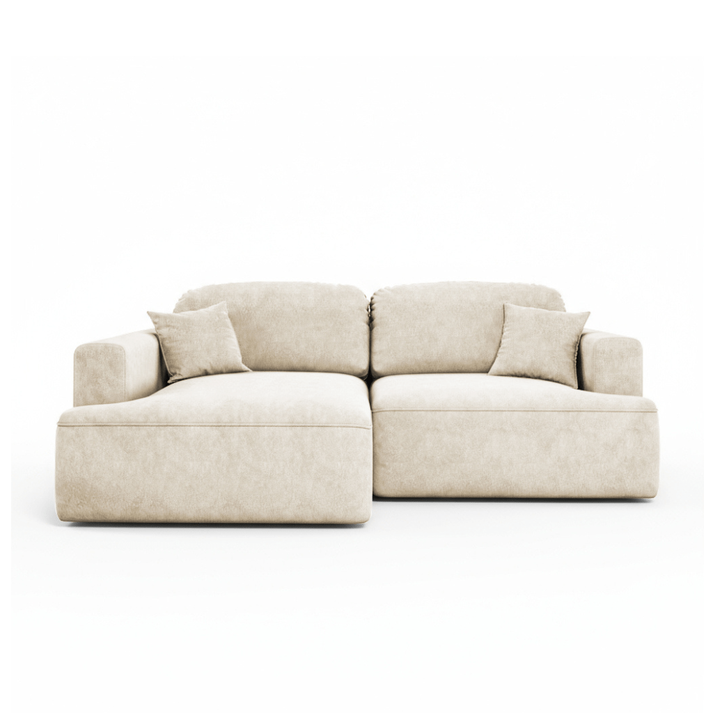 Obicie narożnika wykonano z tkaniny Cloud – przyjemnego w dotyku weluru, który wyróżnia się eleganckim, matowym wykończeniem i subtelną melanżową barwą. To materiał nie tylko piękny, ale również praktyczny – łatwoczyszczący, hydrofobowy oraz odporny na ścieranie, dzięki czemu narożnik długo zachowuje swój atrakcyjny wygląd.