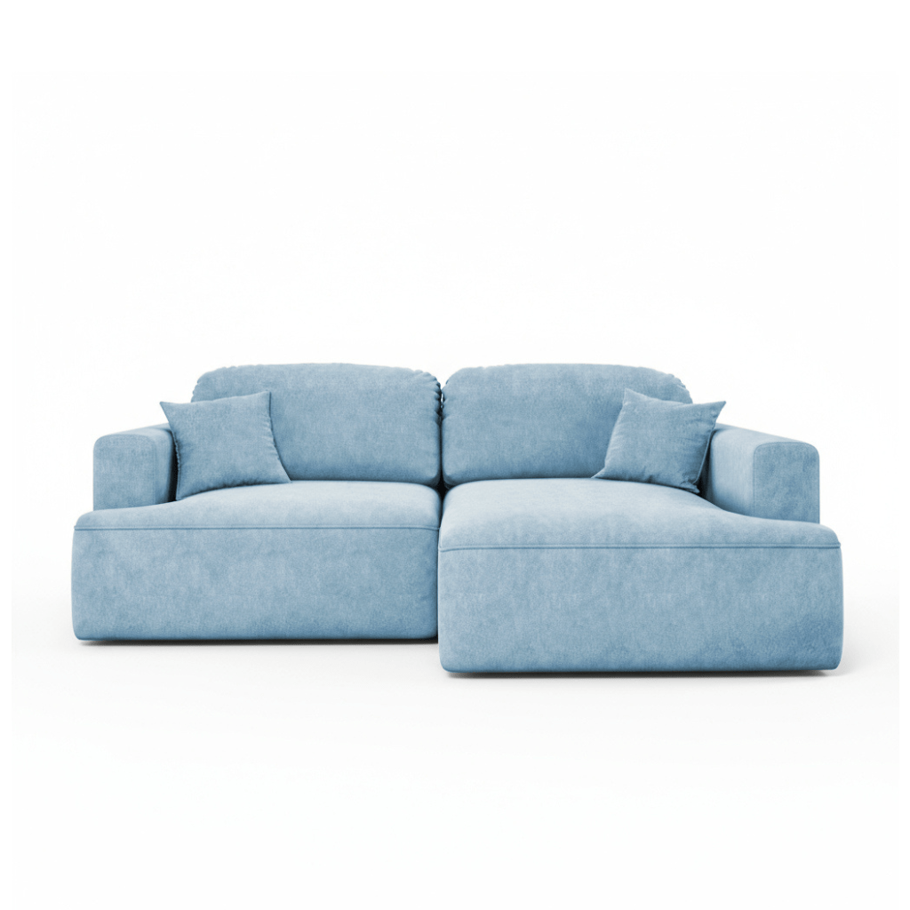 Obicie narożnika wykonano z tkaniny Cloud – przyjemnego w dotyku weluru, który wyróżnia się eleganckim, matowym wykończeniem i subtelną melanżową barwą. To materiał nie tylko piękny, ale również praktyczny – łatwoczyszczący, hydrofobowy oraz odporny na ścieranie, dzięki czemu narożnik długo zachowuje swój atrakcyjny wygląd.