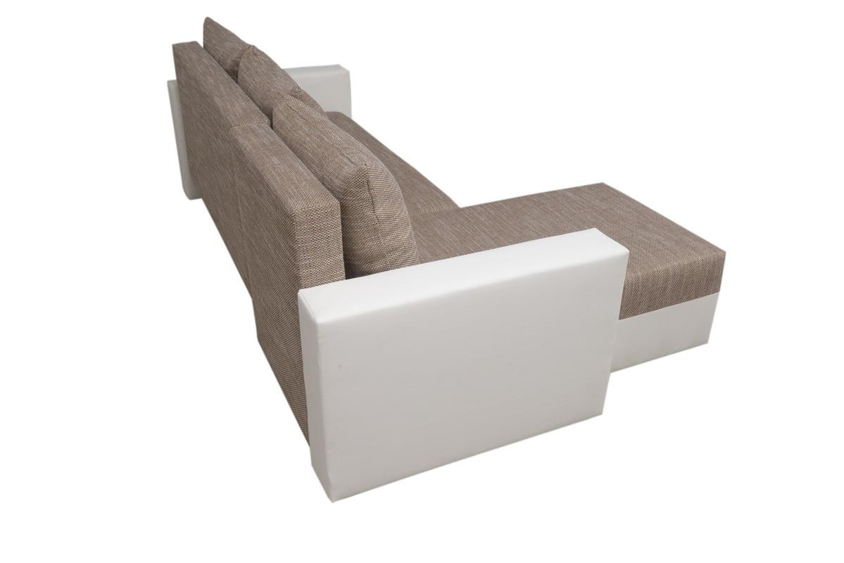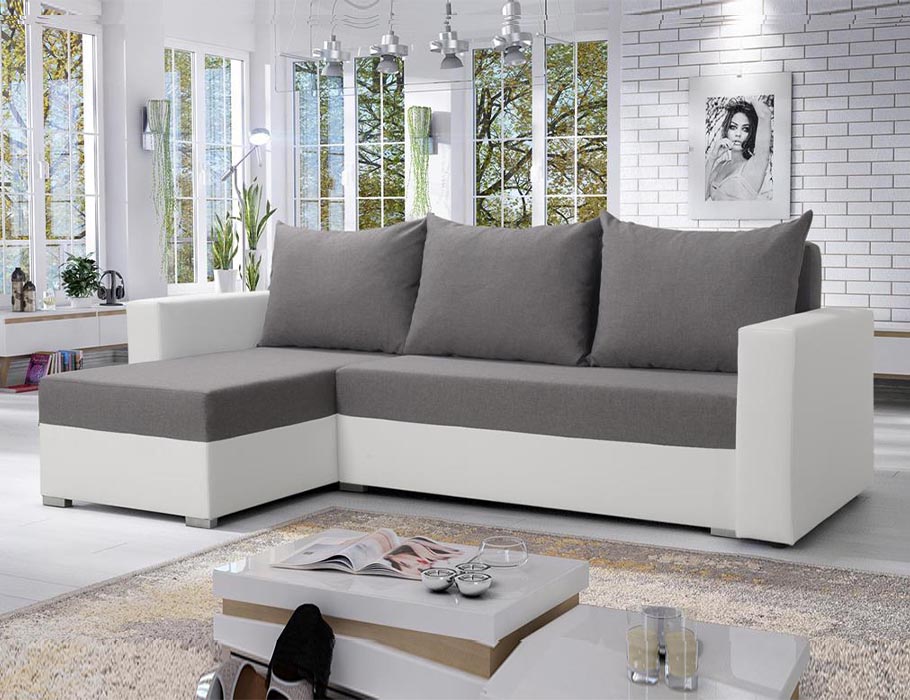 Jego uniwersalny kształt litery L z łatwością wkomponuje się w aranżację salonu. Szaro-biała kolorystyka wprowadza do wnętrza poczucie lekkości, świeżości i spokoju. Dzięki temu mebel staje się idealną bazą dla nowoczesnych lub skandynawskich stylizacji. Tapicerowany tył pozwala na dowolne ustawienie narożnika. Można go umieścić zarówno przy ścianie, jak i w centralnej części pokoju.