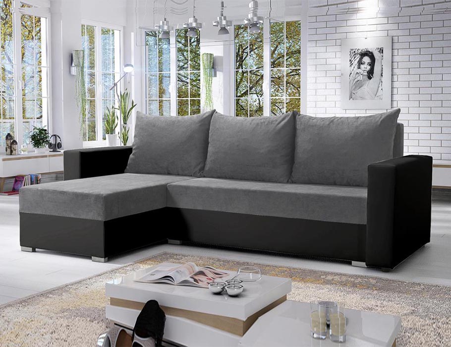 Narożnik z funkcją spania Mojito lewy L-kształtny z pojemnikiem na pościel szara plecionka z czarną ekoskórą