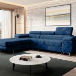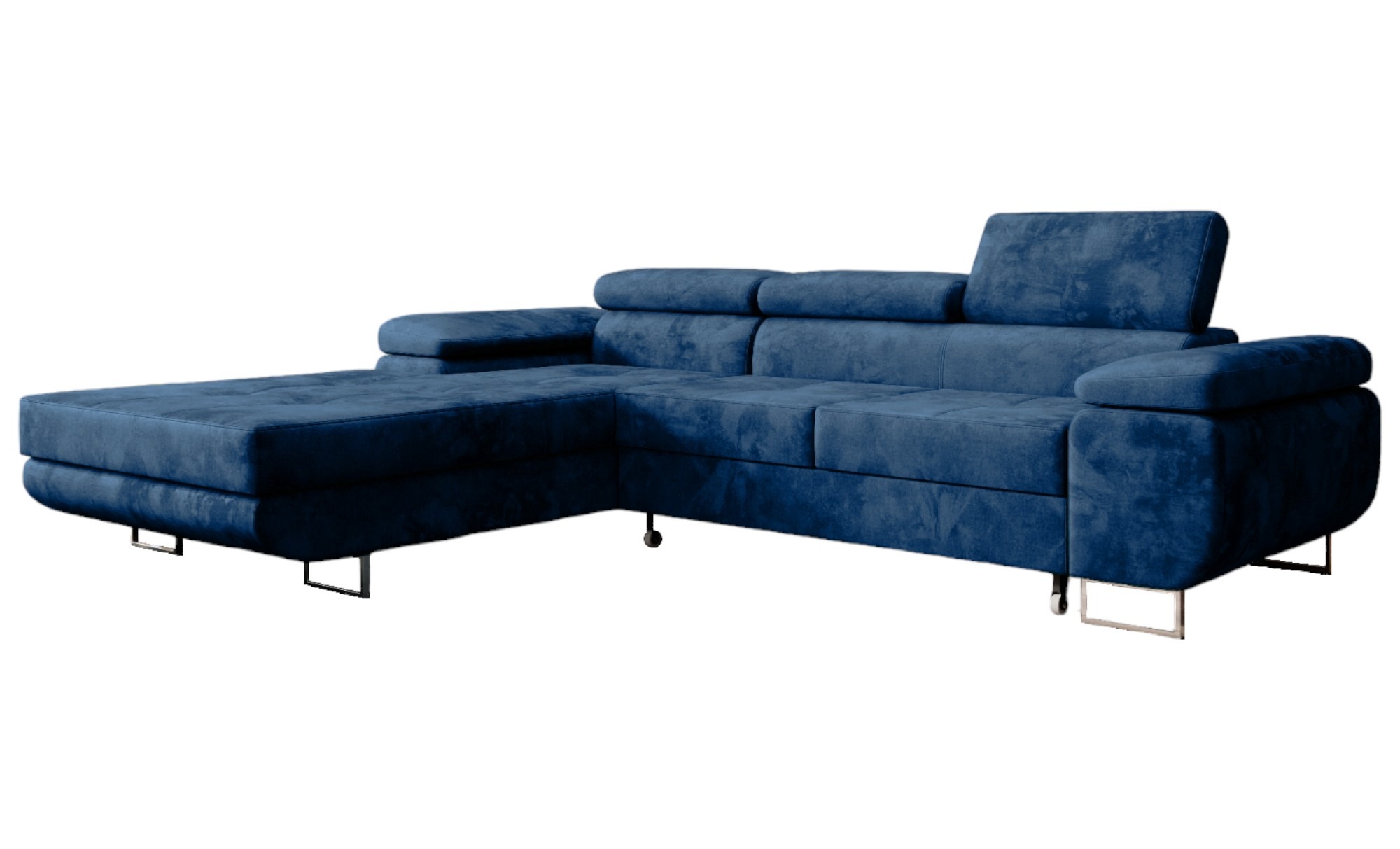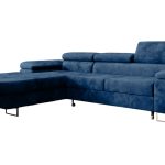 Jego przemyślany układ w kształcie litery L doskonale organizuje przestrzeń w salonie. Wysokie, chromowane nóżki dodają mu wizualnej lekkości. Ułatwiają także utrzymanie czystości pod meblem. Głęboki granatowy kolor tapicerki tworzy we wnętrzu atmosferę spokoju i wyrafinowania. Doskonale pasuje do aranżacji nowoczesnych oraz tych inspirowanych klasyką. Co ważne, tapicerowany tył pozwala ustawić narożnik w dowolnym miejscu, nawet na środku pokoju.