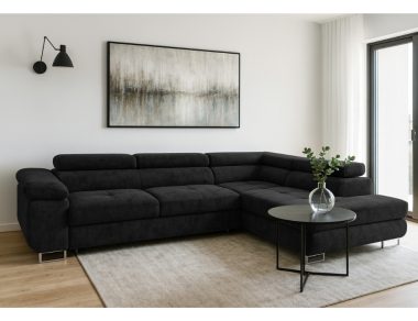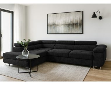 Czarny narożnik dzięki funkcji spania staje się wielofunkcyjnym meblem, który sprawdzi się zarówno podczas dziennego wypoczynku, jak i nocnego relaksu.