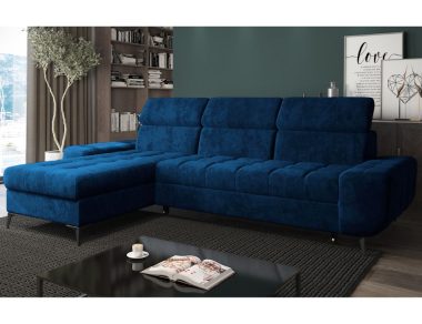 Miękka tapicerka w granatowym kolorze dodaje elegancji i nowoczesności, a jednocześnie jest niezwykle przyjemna w dotyku. Funkcja spania umożliwia szybkie przekształcenie narożnika w wygodne łóżko, co jest niezwykle praktyczne przy przyjmowaniu gości.