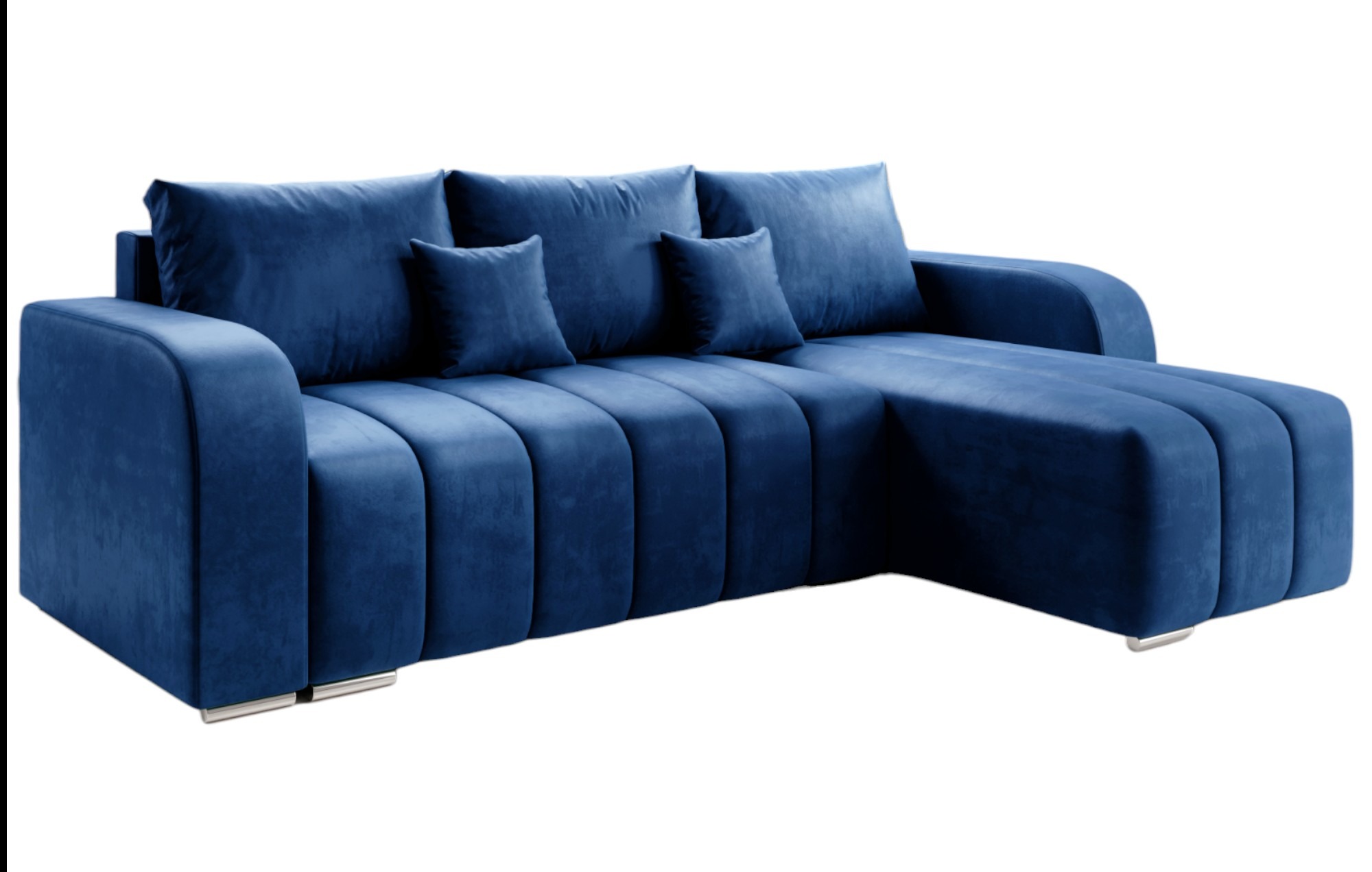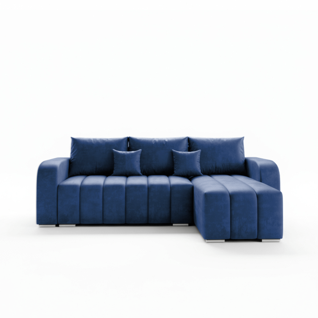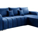Jego praktyczny układ w kształcie litery L naturalnie wyznacza strefę relaksu w salonie. Głęboki granatowy kolor nadaje aranżacji szlachetny i spokojny charakter. Dlatego mebel wspaniale odnajduje się we wnętrzach nowoczesnych oraz tych o klasycznym wystroju. Welurowa tkanina Manila subtelnie odbija światło, dzięki czemu barwa zyskuje niezwykłą głębię. Całość opiera się na smukłych, chromowanych nóżkach, które dodają konstrukcji wizualnej lekkości. Co ważne, tapicerowany tył pozwala ustawić narożnik w dowolnym miejscu, nie tylko przy ścianie.