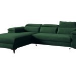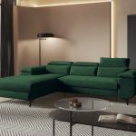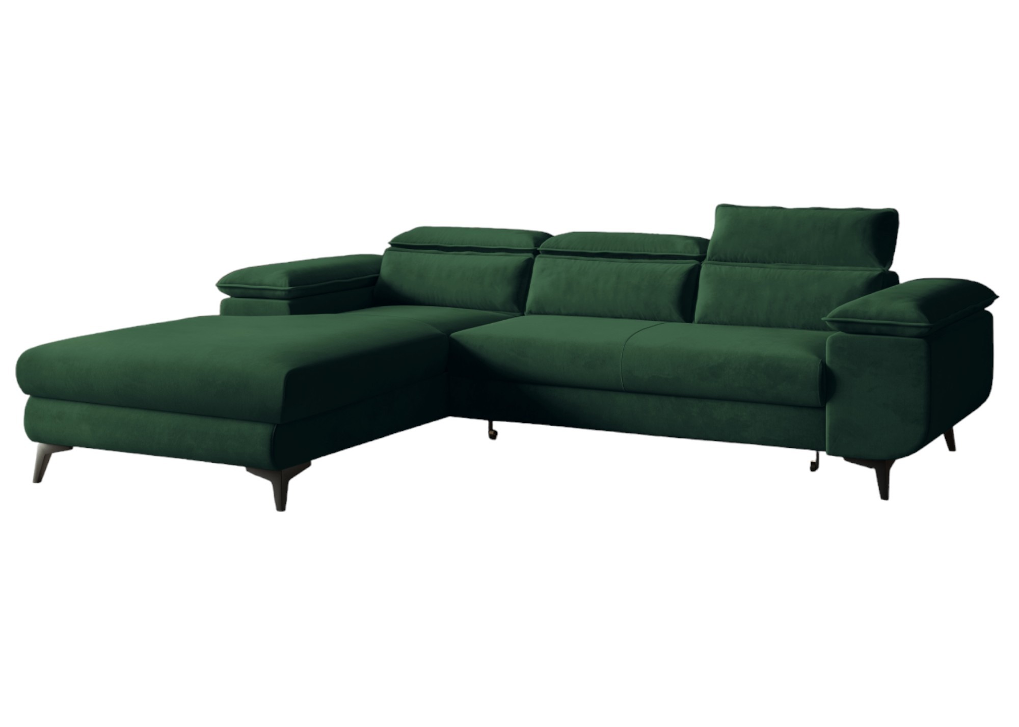 Jego klasyczna bryła w kształcie litery L doskonale odnajduje się w nowoczesnych aranżacjach. Głęboki odcień butelkowej zieleni tworzy przytulną i wyrafinowaną atmosferę. Sprzyja wyciszeniu po długim dniu. Dzięki temu mebel staje się wyrazistym akcentem we wnętrzach urządzonych z drewnem lub złotymi dodatkami. Całość osadzono na wysokich, czarnych nóżkach. Dodają one konstrukcji wizualnej lekkości.
