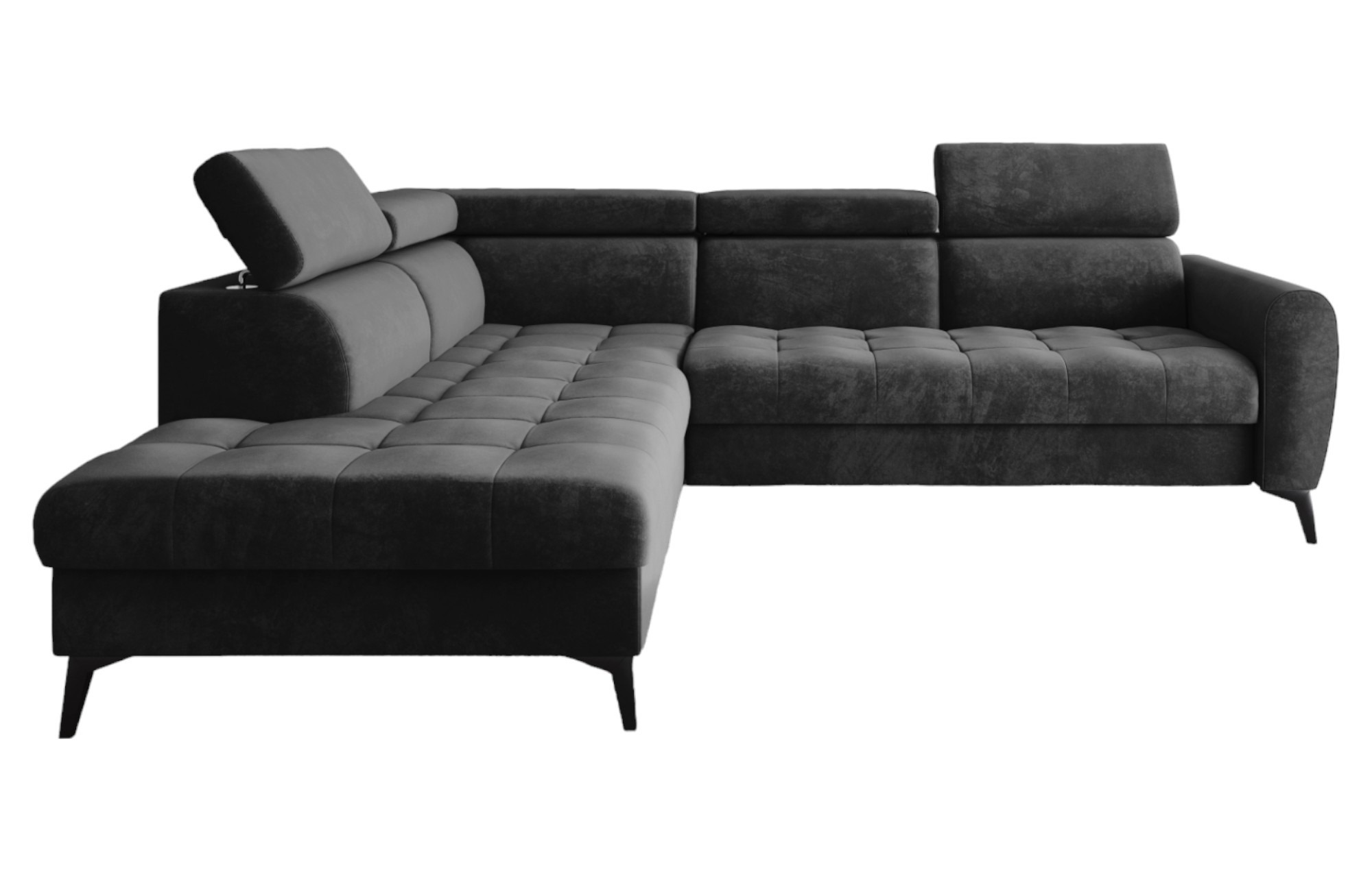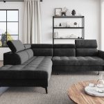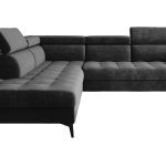 Jego ponadczasowy design w kształcie litery L w naturalny sposób organizuje przestrzeń wypoczynkową. Staje się ona centrum rodzinnych spotkań. Głęboki, grafitowy kolor tapicerki nadaje wnętrzu szyku i spokoju. Dlatego świetnie pasuje zarówno do aranżacji klasycznych, jak i minimalistycznych. Wysokie, chromowane nóżki dodają całej konstrukcji wizualnej lekkości. Co ważne, tapicerowany tył mebla pozwala na ustawienie go w dowolnym miejscu, nawet na środku pokoju.