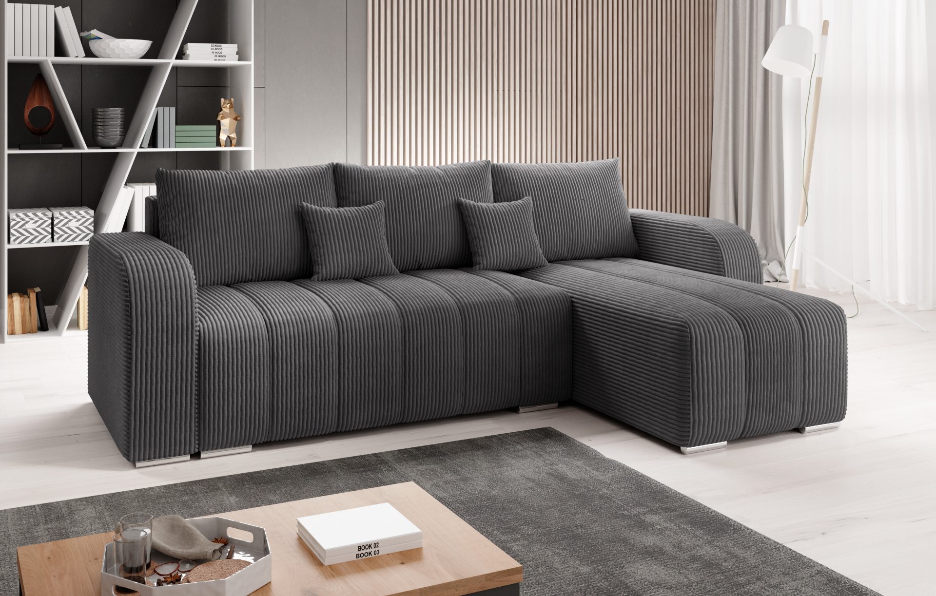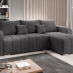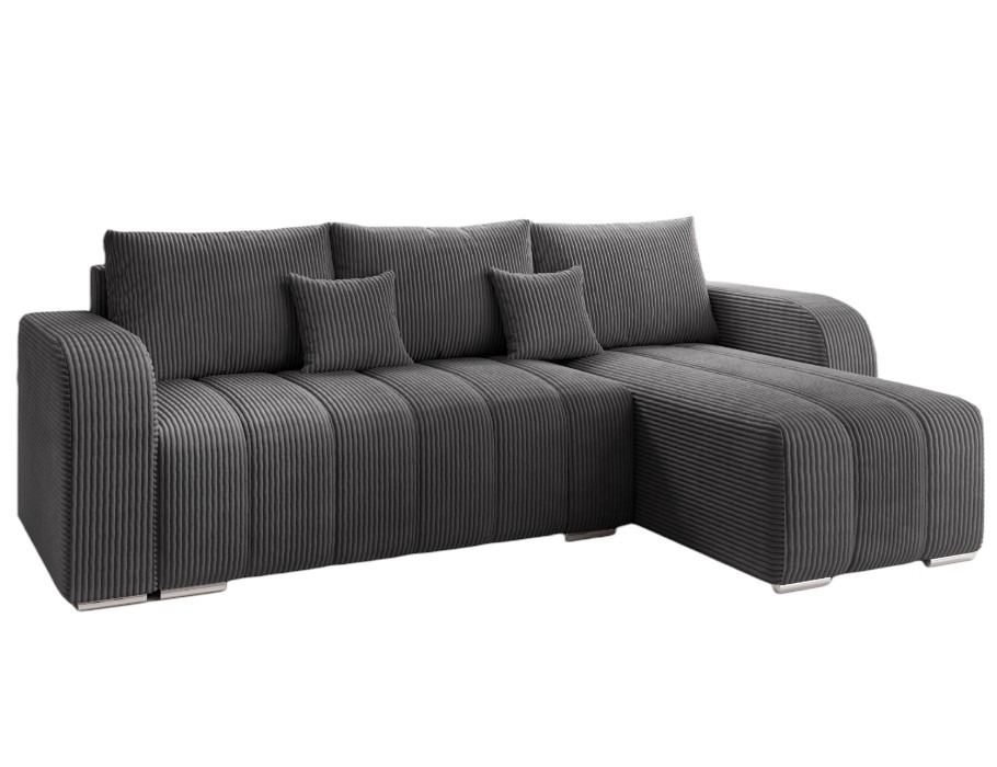 Siedzisko wypełnione sprężynami bonellowymi oraz pianką zapewnia stabilne i wygodne podparcie. Duże, miękkie poduchy oparciowe zachęcają do odpoczynku po długim dniu. Narożnik wyposażono także w intuicyjną funkcję spania. Dzięki niej w kilka chwil można przygotować komfortowe miejsce dla gości. Z kolei pojemny schowek na pościel ułatwia utrzymanie porządku w pokoju dziennym.