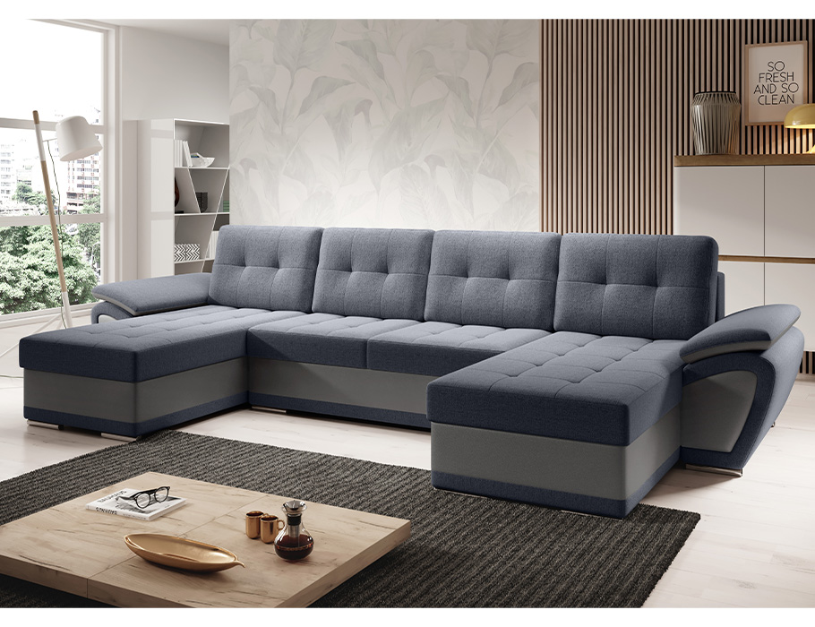 Narożnik Enzo U został zaprojektowany z myślą o codziennej wygodzie. Gdy pojawią się goście, mebel można błyskawicznie przekształcić w obszerne miejsce do spania. Rozkładanie za pomocą automatu DL jest płynne i nie wymaga przy tym wysiłku. Dużą zaletę stanowi także praktyczny pojemnik na pościel. Dzięki niemu dodatkowe koce i poduszki są zawsze pod ręką, a w salonie łatwiej utrzymać porządek.
