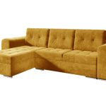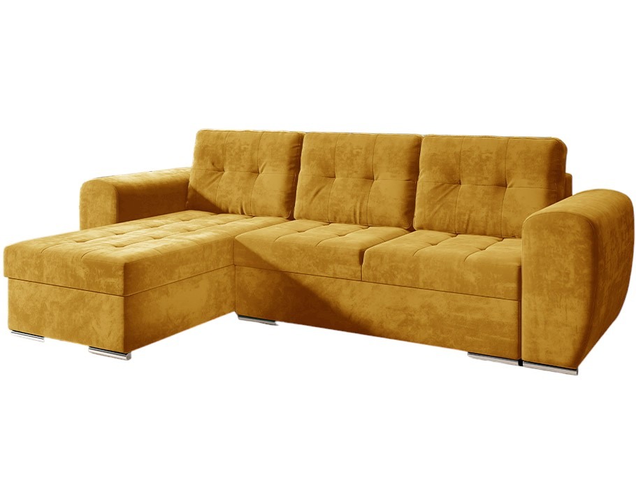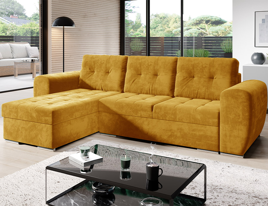 Jego uniwersalny kształt litery L pozwala na wygodne zaaranżowanie przestrzeni w salonie. Prosta bryła opiera się na niskich, chromowanych nóżkach. Dodają one całości wizualnej lekkości i nowoczesnego charakteru. Wyrazisty, musztardowy odcień weluru staje się centralnym punktem pokoju. Wprowadza do wnętrza energię oraz niezwykle przytulny klimat.