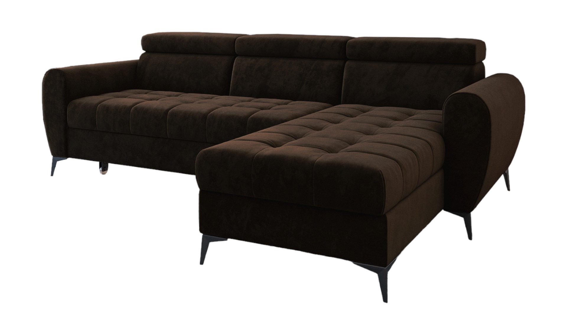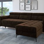 Jego L-kształtny układ doskonale wypełnia przestrzeń salonu. Smukłe, czarne nóżki dodają mu wizualnej lekkości. Dzięki temu bryła nabiera subtelnego charakteru, zachowując stabilność. Ciepły, brązowy odcień wprowadza do wnętrza przytulną atmosferę inspirowaną naturą. Dlatego narożnik świetnie wpisuje się w aranżacje nowoczesne oraz swobodne stylizacje boho.