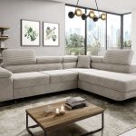 Jego nowoczesna bryła w kształcie litery L doskonale organizuje przestrzeń w salonie. Wprowadza do wnętrza spokój i wizualne ciepło. Dlatego kremowy odcień świetnie pasuje do aranżacji skandynawskich, minimalistycznych lub boho. Wysokie, czarne nóżki dodają konstrukcji lekkości i subtelnej elegancji. Co ważne, tapicerowany tył pozwala ustawić narożnik w dowolnym miejscu, nawet na środku otwartej strefy dziennej.