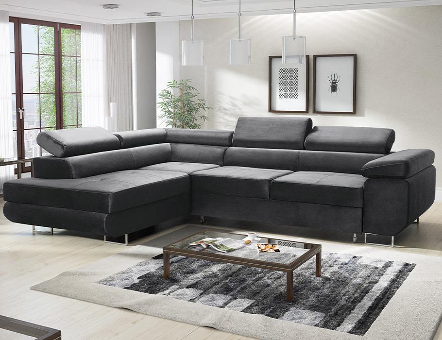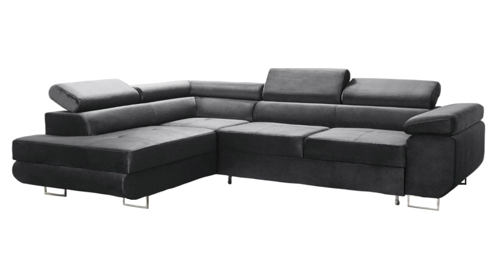 Jego prosta, geometryczna bryła zyskuje lekkość dzięki wysokim, chromowanym nóżkom. Narożnik w kształcie L doskonale wypełnia przestrzeń w salonie, tworząc wygodne miejsce do wspólnego spędzania czasu. Głęboki grafitowy odcień wprowadza do wnętrza atmosferę elegancji i spokoju. Dlatego idealnie pasuje do aranżacji nowoczesnych oraz industrialnych, stając się ich wyrazistym akcentem.