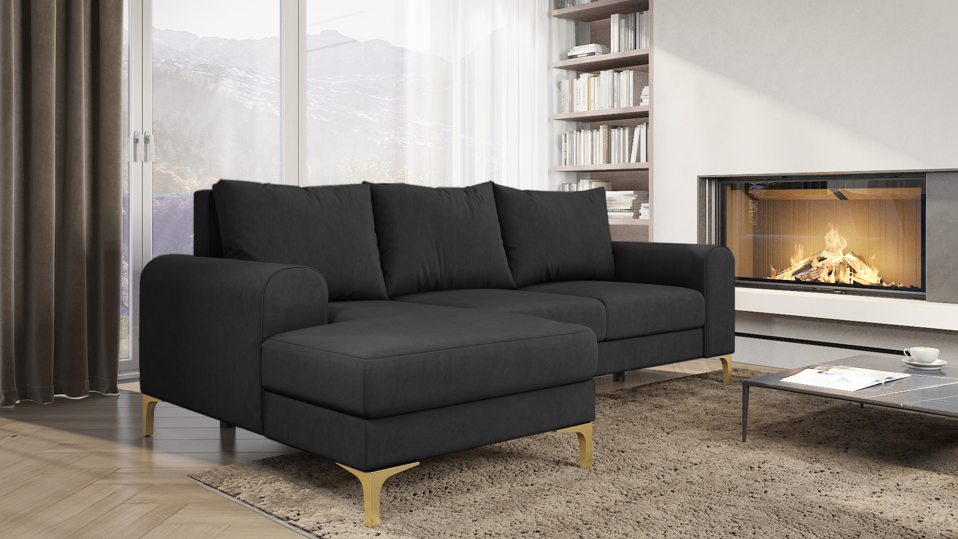 Jego kształt w formie litery L naturalnie wyznacza w salonie strefę relaksu. Głęboki, grafitowy odcień tapicerki dodaje aranżacji szlachetnego charakteru. Dlatego doskonale odnajduje się we wnętrzach nowoczesnych oraz w stylu boho. Wysokie, złote nóżki nadają całej bryle wizualnej lekkości. Jednocześnie subtelnie przełamują stonowaną barwę obicia.