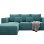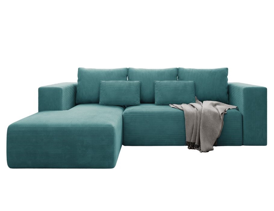 Jego L-kształtny układ wpasuje się w aranżację nowoczesnego pokoju dziennego. Ponadczasowy design mebla sprawia, że będzie on ozdobą wnętrza przez wiele lat. Głęboki, turkusowy odcień tapicerki ożywia przestrzeń. Staje się wyrazistym akcentem, który nadaje jej niepowtarzalnego charakteru. Co ważne, tapicerowany tył narożnika pozwala na ustawienie go w dowolnym miejscu, nawet na środku salonu.