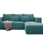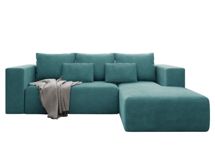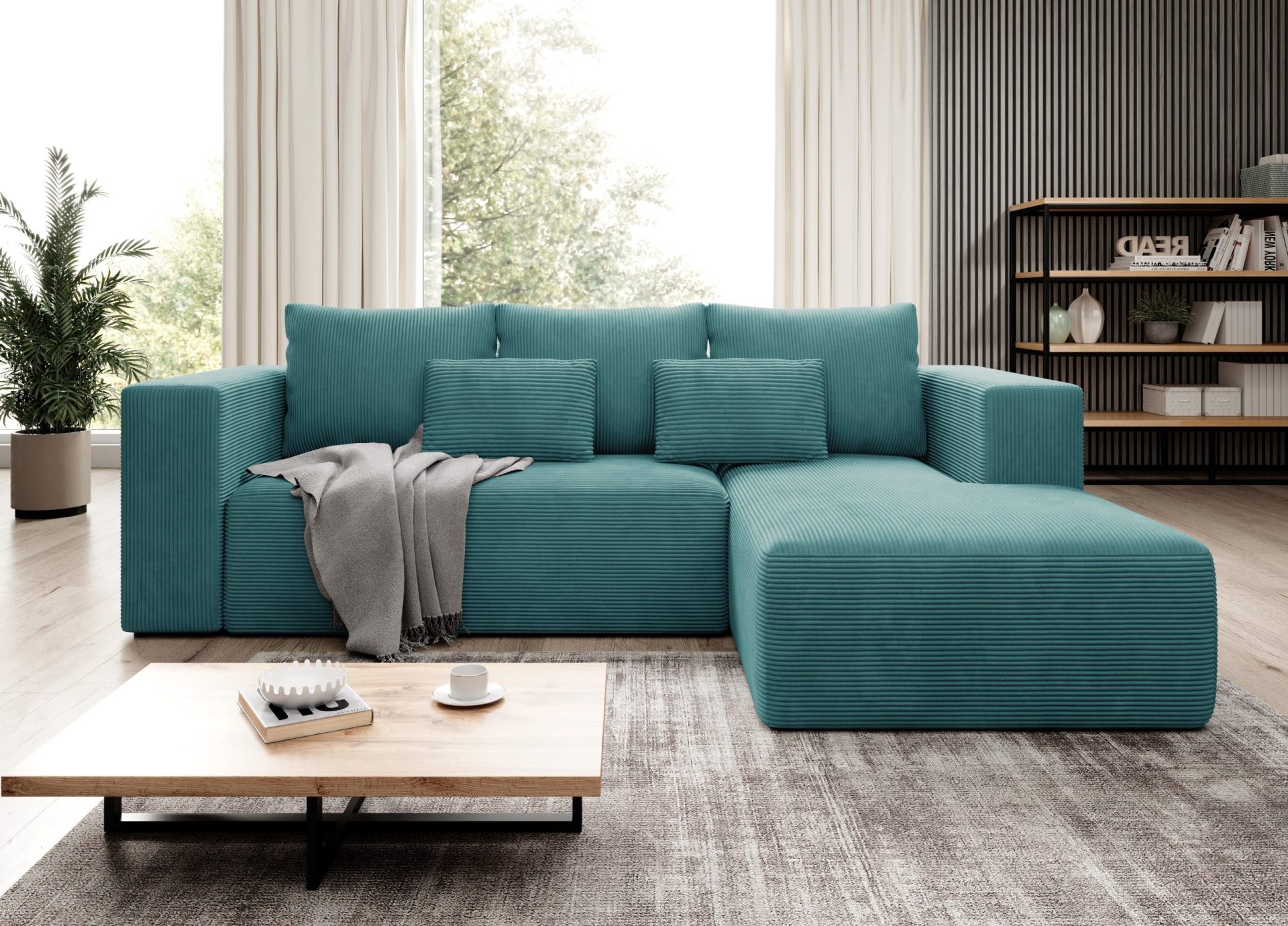 Jego L-kształtna forma doskonale organizuje przestrzeń w salonie. Wyrazisty turkusowy odcień wnosi do aranżacji energię oraz powiew świeżości. Kolor ten pięknie komponuje się z jasnym drewnem lub dodatkami w odcieniach bieli. W ten sposób tworzy wnętrze z nowoczesnym charakterem. Duże, luźne poduszki oparciowe zapraszają do wygodnego odpoczynku. Co ważne, tapicerowany tył mebla pozwala na ustawienie go w dowolnym miejscu pokoju.