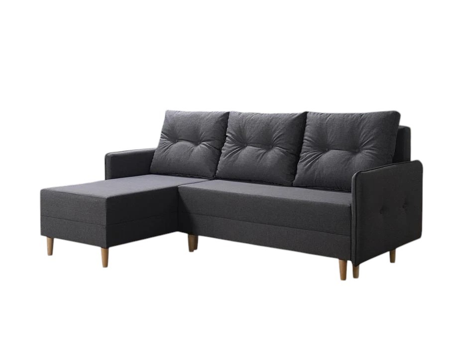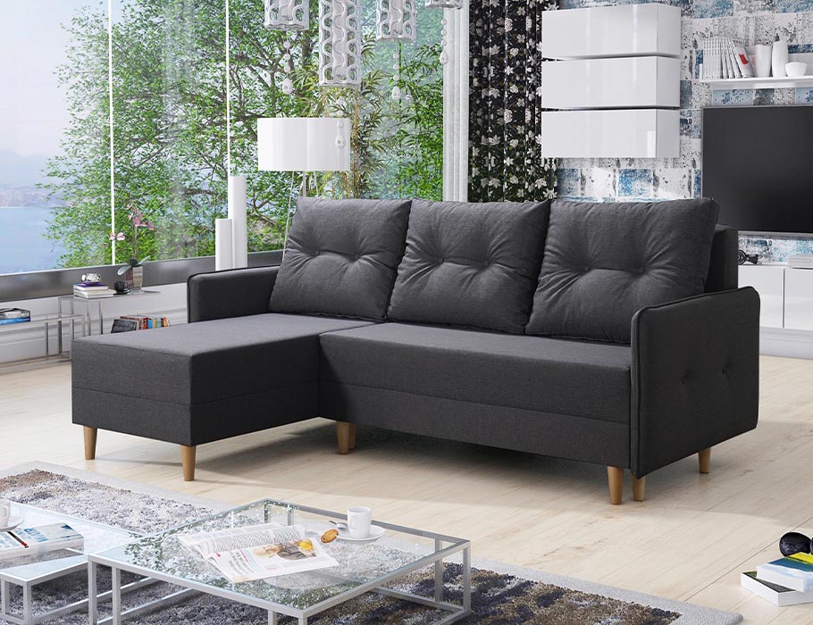 Wysoki komfort wypoczynku to zasługa siedziska wypełnionego sprężynami bonellowymi oraz pianką. Trzy duże poduszki oparciowe zapewniają wygodne podparcie pleców podczas wieczornego relaksu z książką. Narożnik rozkłada się za pomocą prostego w obsłudze systemu DL. Dzięki temu można w kilka chwil przygotować komfortowe miejsce do spania dla gości. Z kolei praktyczny pojemnik na pościel ułatwia przechowywanie tekstyliów i utrzymanie porządku na co dzień.