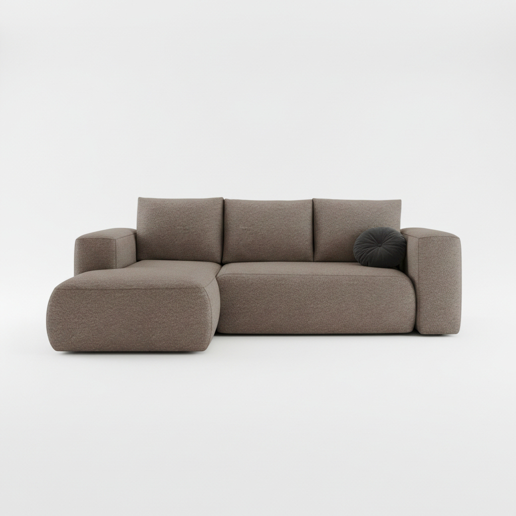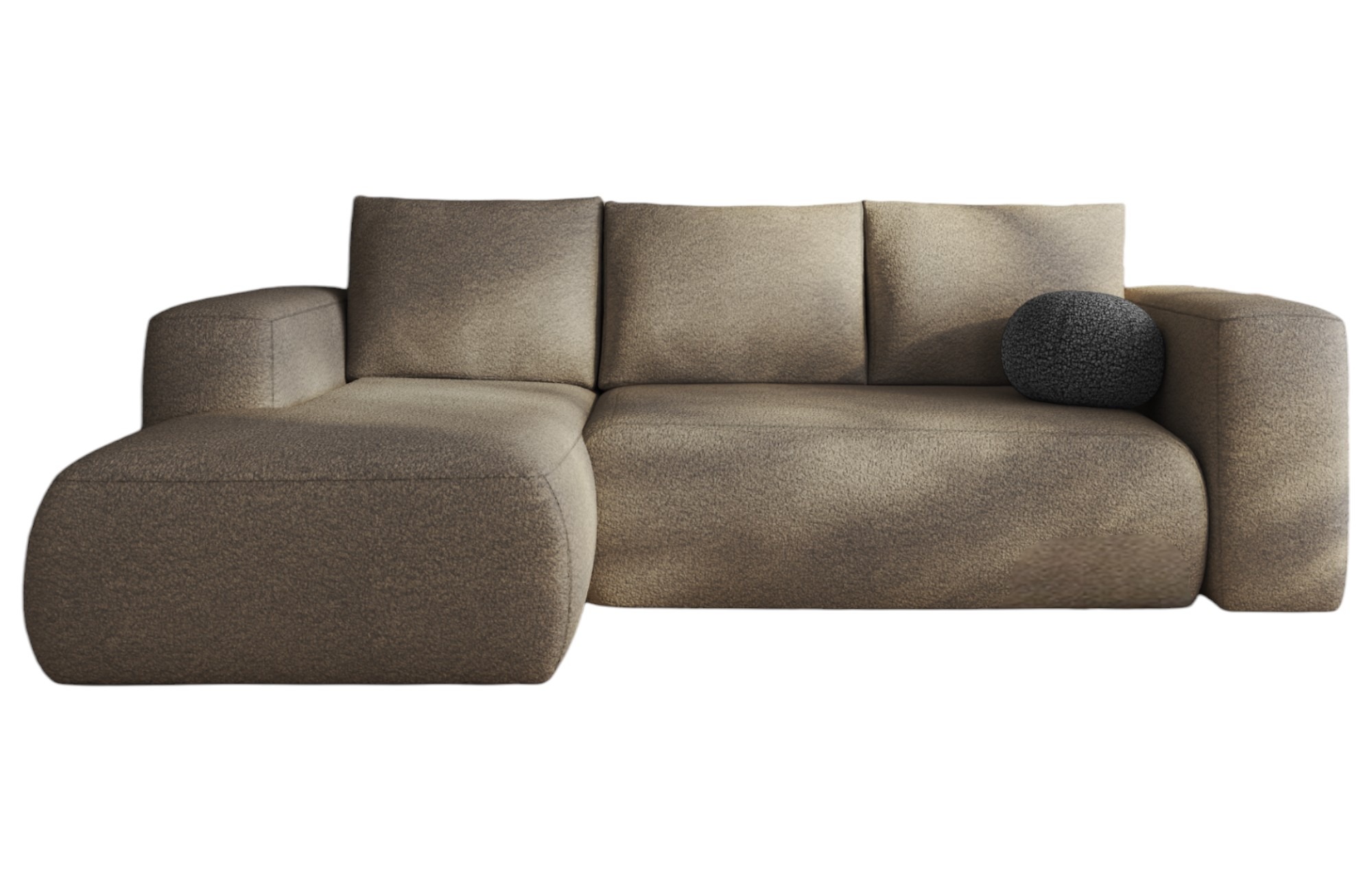 Jego przemyślany kształt w formie litery L naturalnie organizuje przestrzeń w pokoju dziennym. Jasnobrązowy odcień tapicerki wprowadza do wnętrza ciepło i spokój. Dlatego świetnie komponuje się ze stylem boho lub nowoczesnymi aranżacjami. Całość osadzono na niskich, czarnych nóżkach, które dodają konstrukcji wizualnej lekkości. Unikalna faktura tkaniny boucle przyciąga wzrok i zachęca do odpoczynku.