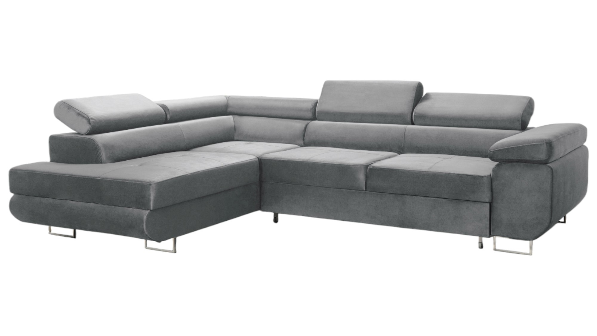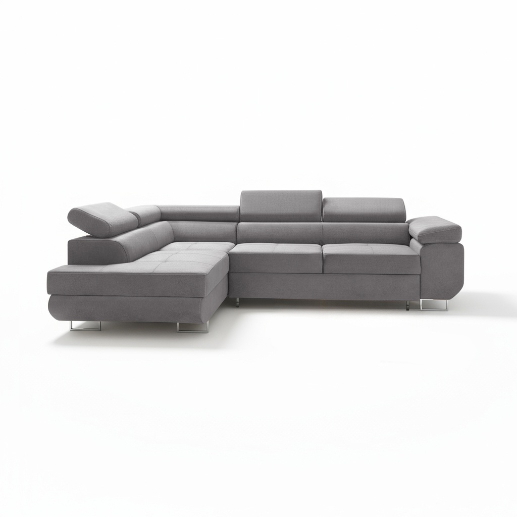 Jego nowoczesna bryła w kształcie litery L doskonale organizuje przestrzeń w salonie. Wysokie, chromowane nóżki dodają konstrukcji wizualnej lekkości i podkreślają jej współczesny charakter. Uniwersalny szary kolor tapicerki stanowi idealną bazę dla różnorodnych aranżacji, od minimalistycznych po bardziej odważne. Tworzy spokojną, stonowaną atmosferę, która sprzyja wyciszeniu po długim dniu. Co ważne, tapicerowany tył pozwala ustawić mebel w dowolnym miejscu, nawet na środku otwartego pokoju.