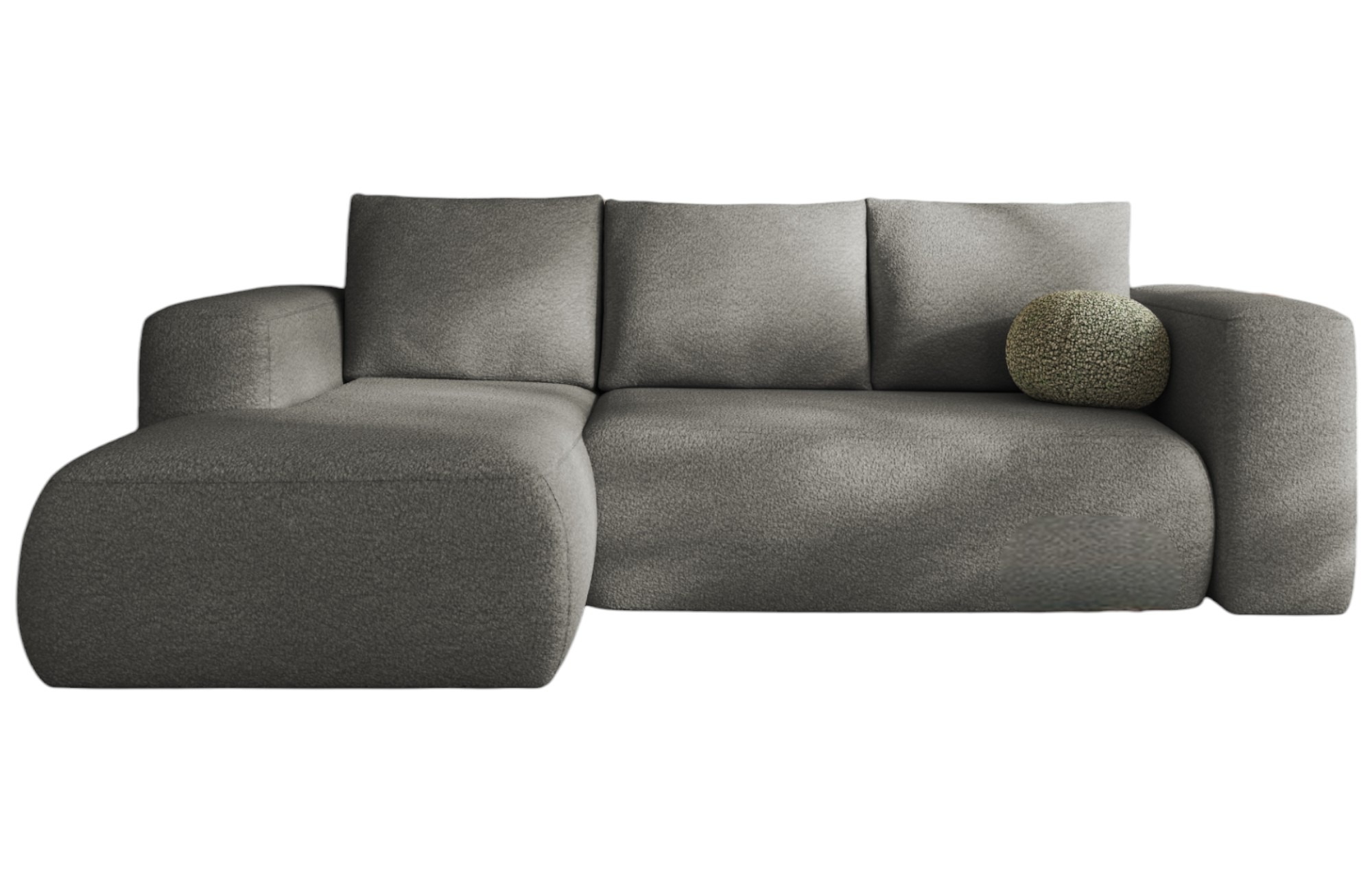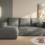 Jego nowoczesna bryła w kształcie litery L świetnie komponuje się z wnętrzami w stylu boho lub minimalistycznym. Szlachetny szary odcień tworzy w salonie spokojną i elegancką atmosferę. Stanowi dzięki temu doskonałą bazę dla drewnianych mebli i żywych, kolorowych akcentów. Co ważne, tapicerowany tył pozwala ustawić mebel w dowolnym miejscu. Można nim subtelnie oddzielić strefę wypoczynku od reszty pomieszczenia.