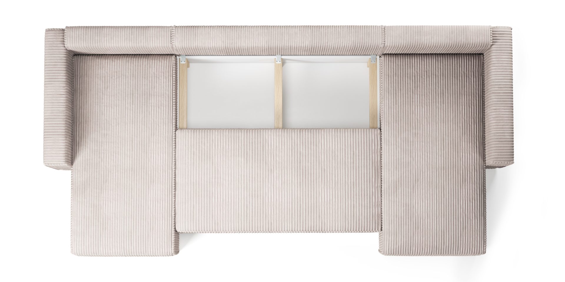 Narożnik Mimir U doskonale sprawdza się podczas spotkań z bliskimi. Oferuje aż cztery komfortowe miejsca do siedzenia. Wypełnienie siedziska oraz oparcia sprężynami bonellowymi dba o wygodę wszystkich domowników. W razie potrzeby mebel można łatwo zmienić w duże łóżko dla gości za pomocą prostego systemu rozkładania typu DL. Dodatkowym atutem jest duży pojemnik na pościel. W ten sposób utrzymanie porządku w salonie staje się znacznie łatwiejsze.