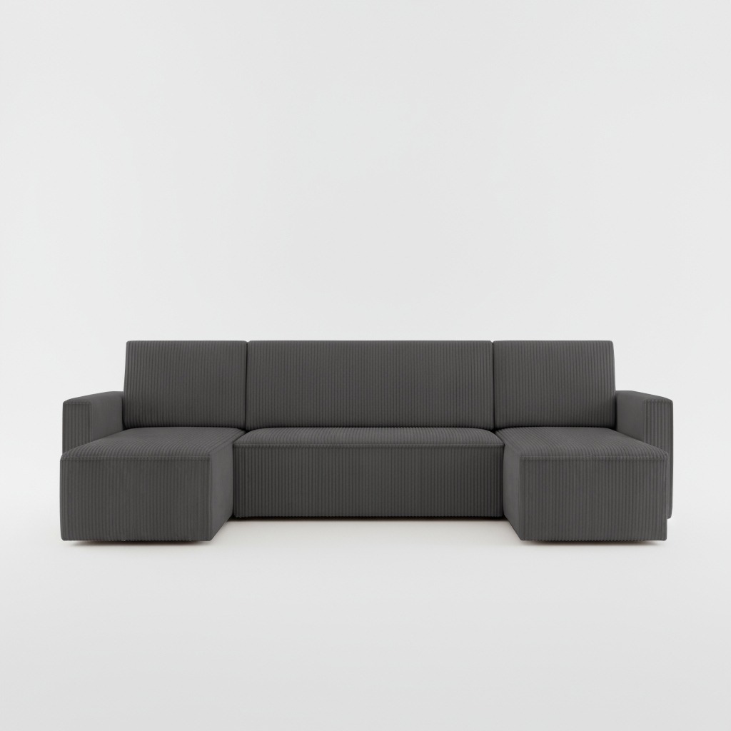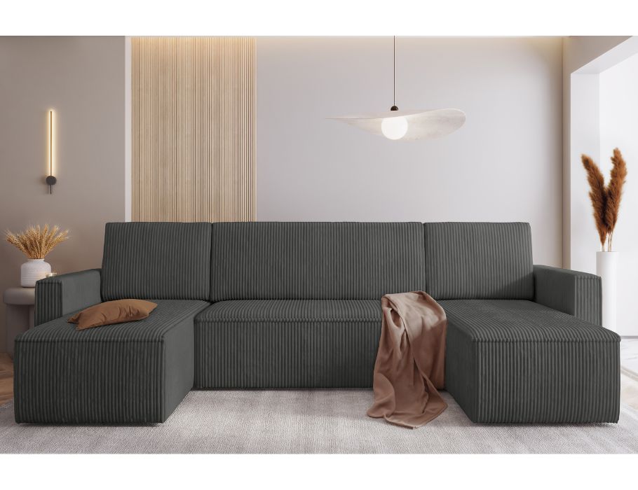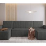 Jego imponujący kształt litery U tworzy w salonie przytulną strefę relaksu. Staje się naturalnym centrum domowego życia, idealnym do wspólnego spędzania czasu. Głęboki, ciemnoszary odcień tapicerki wprowadza do aranżacji spokój i ponadczasową elegancję. Dlatego mebel świetnie pasuje do wnętrz klasycznych oraz nowoczesnych. Subtelne, niskie nóżki w czarnym kolorze stanowią dyskretne dopełnienie całej bryły.