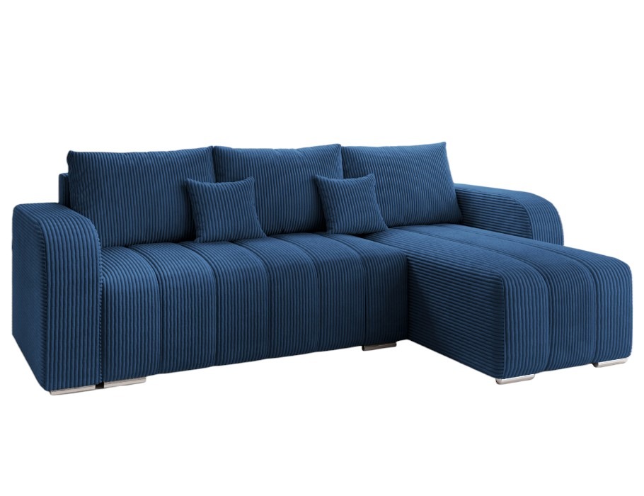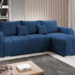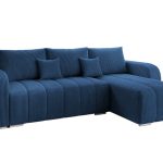 Jego nowoczesna bryła w kształcie litery L idealnie organizuje przestrzeń w salonie. Głęboki granat tapicerki wprowadza do wnętrza atmosferę elegancji i spokoju. Kolor ten doskonale komponuje się z jasnymi ścianami i drewnianymi dodatkami. W ten sposób mebel staje się wyrazistym, a zarazem kojącym elementem wystroju. Chromowane nóżki dodają mu lekkości i subtelnie podkreślają współczesny charakter. Dzięki tapicerowanemu tyłowi narożnik można ustawić w dowolnym miejscu, nawet na środku pokoju.